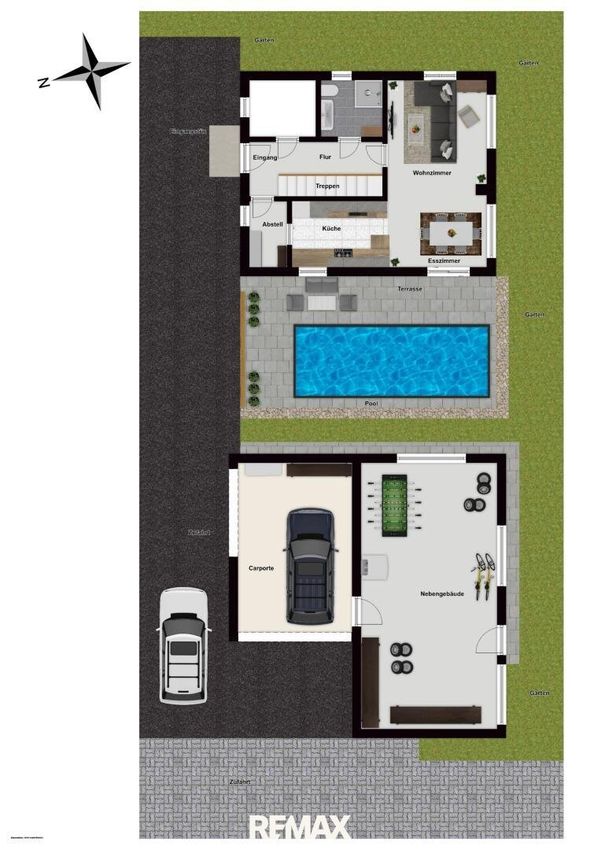 Besonders hervorzuheben ist der liebevoll gestaltete Außenbereich mit sonniger Terrasse, Pool und viel Platz für Freizeit und Geselligkeit. Das separate Carport bietet Stellfläche für zwei Fahrzeuge und beherbergt ein rund 40 m² großes Nebengebäude – vielseitig nutzbar, etwa als Wellnessoase mit Sauna, als Werkstatt oder kreatives Atelier.