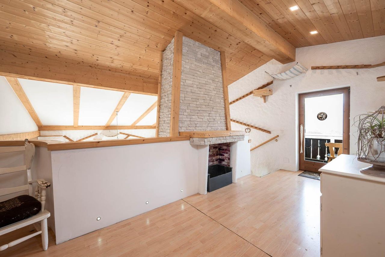 Ein halber Stock versetzt eröffnet sich ein weiterer Wohnbereich ebenfalls mit einem gemütlichem Kamin – perfekt für entspannte Abende. Der offene Galerieblick verleiht dem Raum zusätzliche Weite und verbindet die Ebenen auf stilvolle Weise. Von hier aus gelangen Sie direkt auf die Terrasse und genießen den freien Blick in die beeindruckende Berglandschaft.