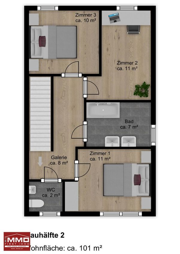 OG: Galerie von wo aus sämtliche Räume zentral begehbar sind, drei Schlafzimmer, ein WC mit Handwaschbecken und ein Badezimmer mit Fenster, Doppelhandwaschbecken, Dusche und Badewanne