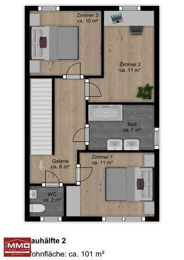 Die Wohnfläche erstreckt sich über ca. 102m² mit vier Zimmern und teilt sich wie folgt auf: