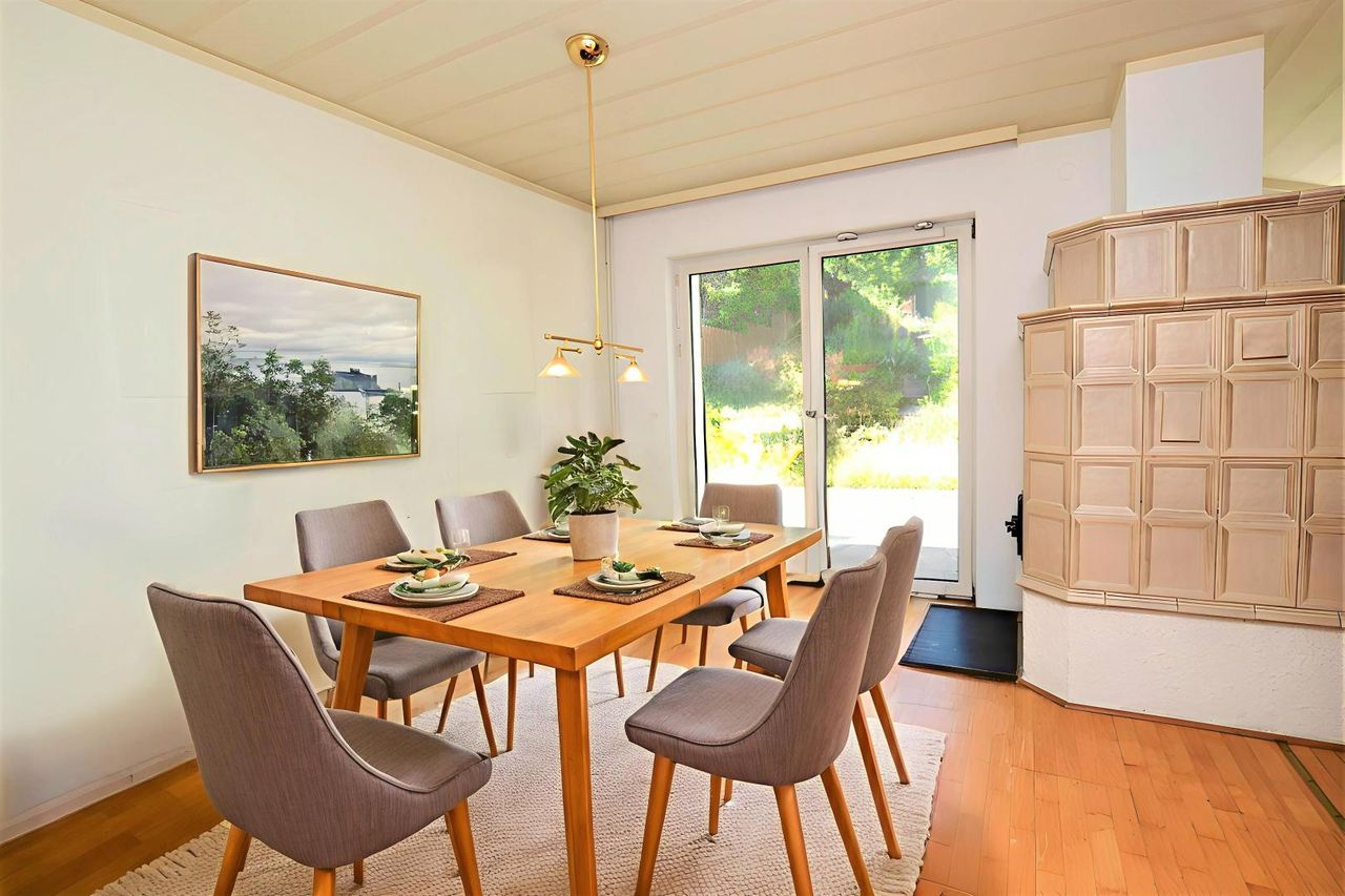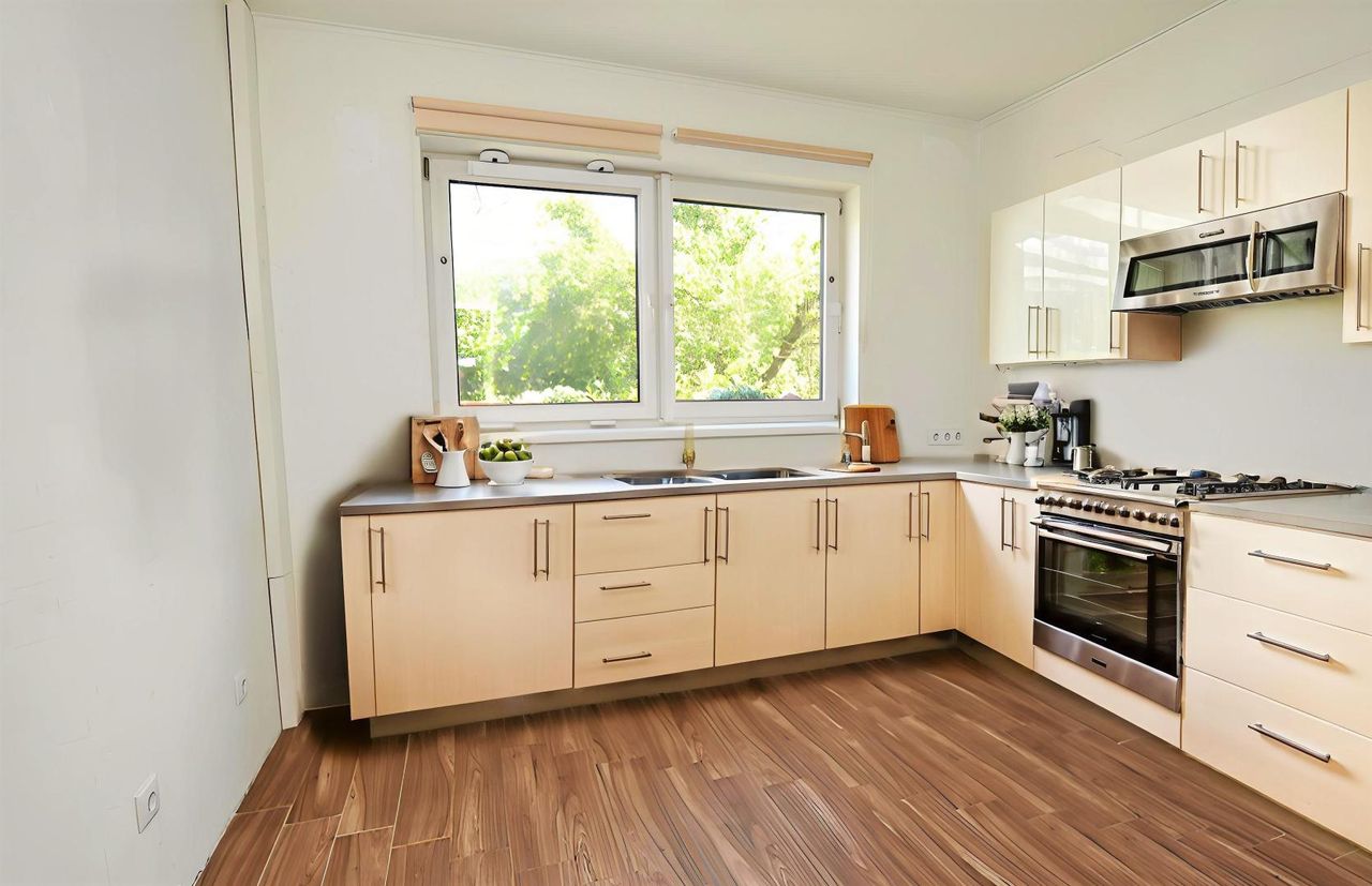 Zur linken Seite befindet sich eine separate Küche mit ca. 9 m², während Sie geradeaus das Esszimmer betreten – mit direktem Zugang auf die Terrasse und in den sonnigen, weitläufigen Garten – perfekt für entspannte Stunden im Grünen.