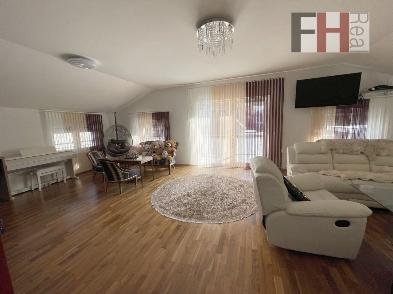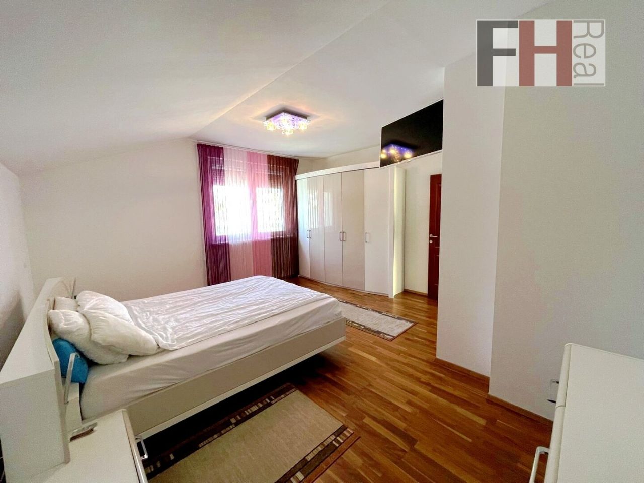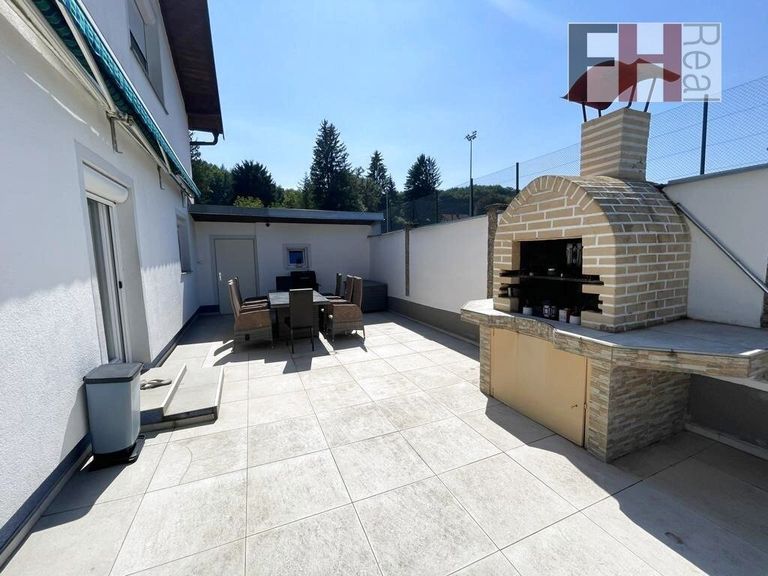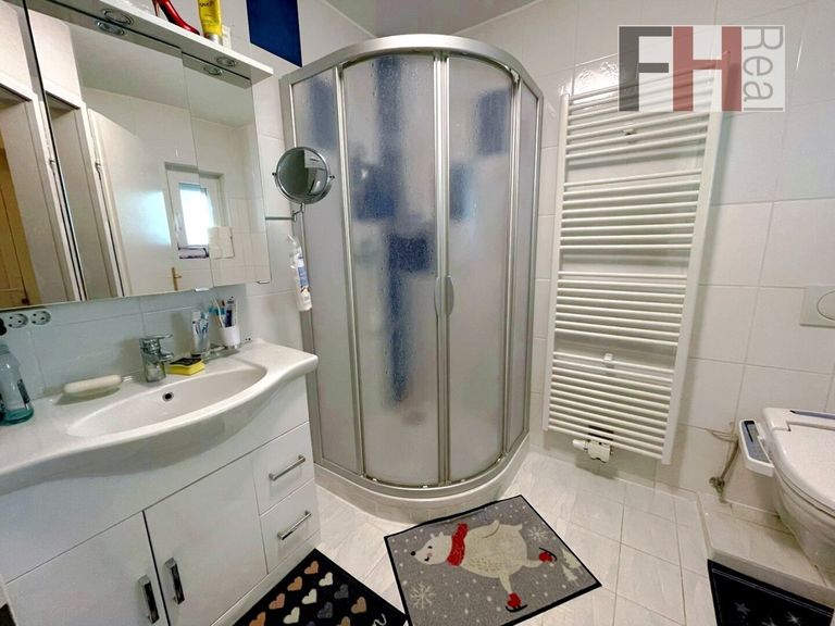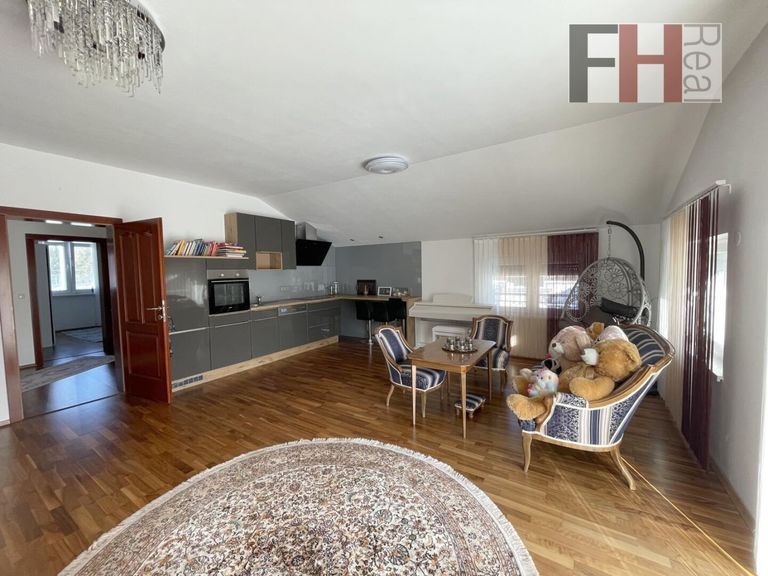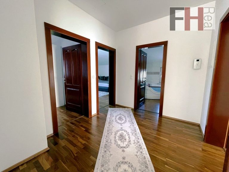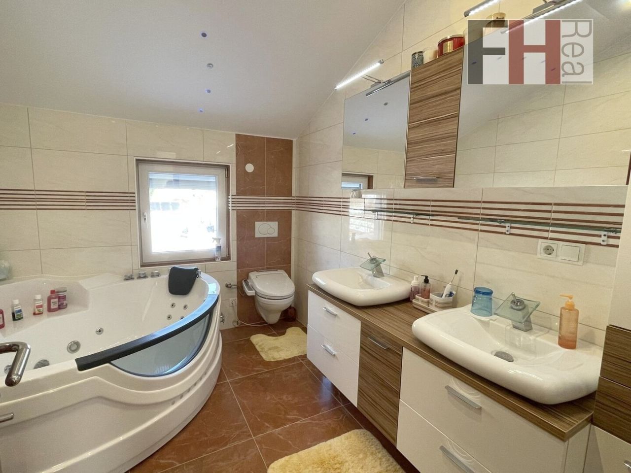 Eine Stiege führt vom Flur direkt in das Obergeschoß. Von dort erreicht man einen sehr großen Wohnbereich mit einer eigenen Küchenzeile. Eine ca.10m2 Terrasse mit Blick in den Garten ist vom Wohnraum begehbar. 2 großzügige Schlafzimmer, zentral begehbar und ein luxuröses Badezimmer mit 2 Handwaschbecken und einem Eck-Wirlpool runden das Angebot positiv ab.