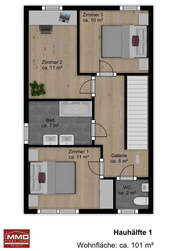 OG: Galerie von wo aus sämtliche Räume zentral begehbar sind, drei Schlafzimmer, ein WC mit Handwaschbecken und ein Badezimmer mit Fenster, Doppelhandwaschbecken, Dusche und Badewanne