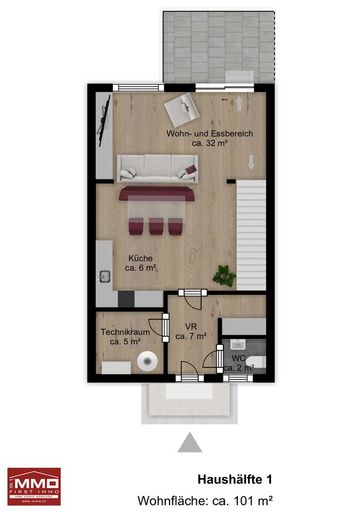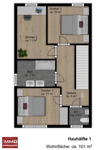 Die Wohnfläche erstreckt sich über ca. 102m² mit vier Zimmern und teilt sich wie folgt auf:
