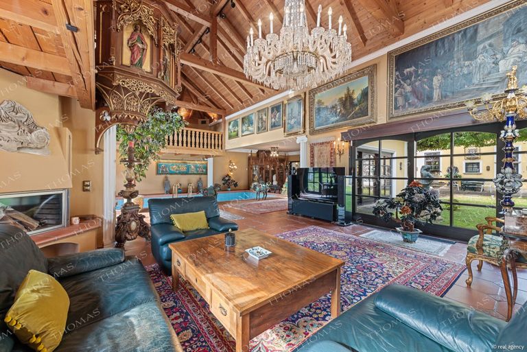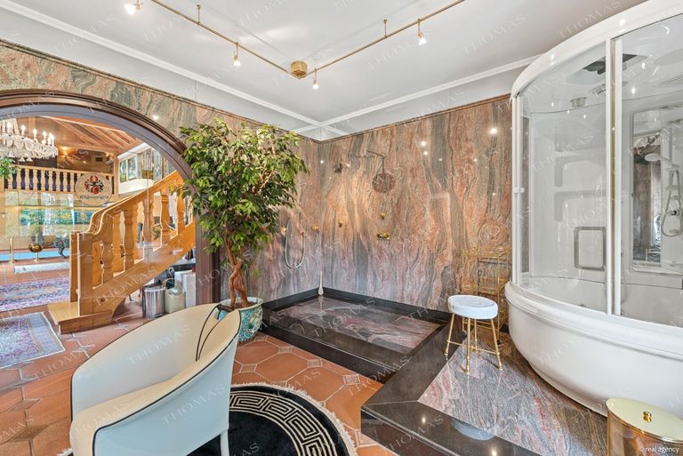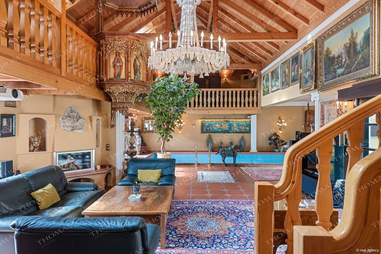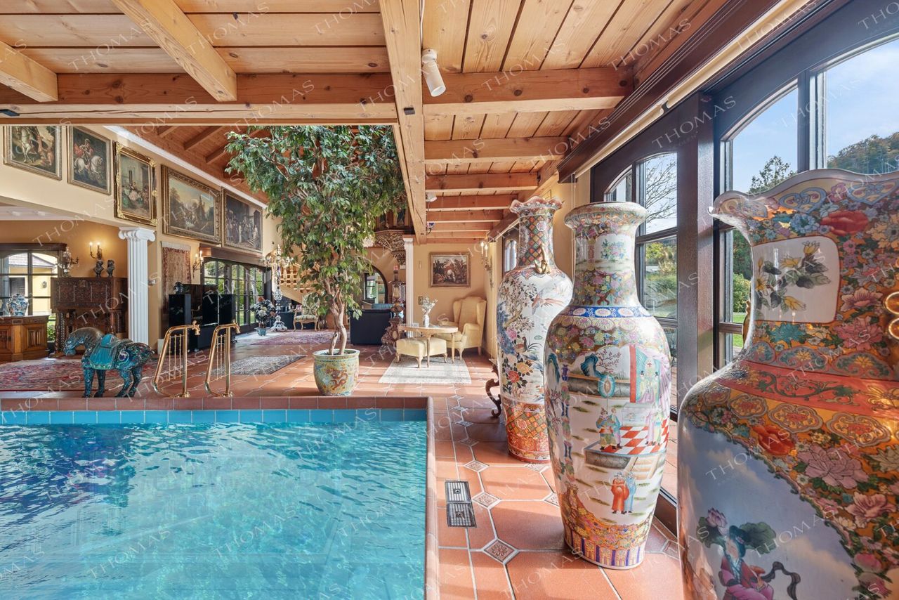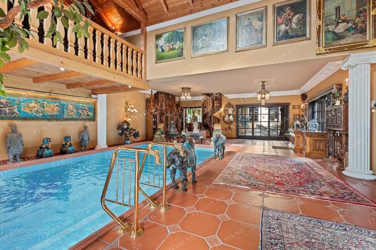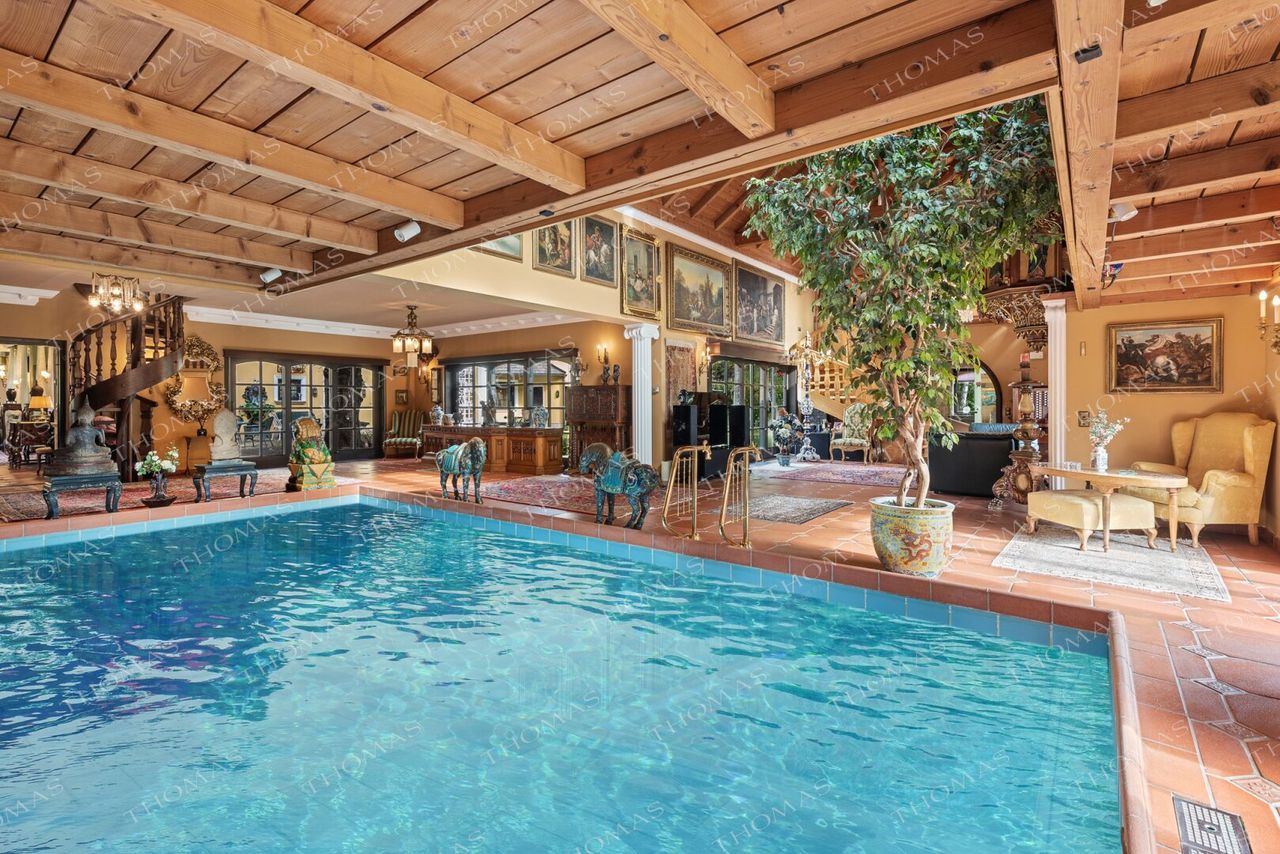 The spectacular annex offers a heated indoor pool, sauna, steam bath, fireplace lounge, and an open gallery – an ideal setting for a private gym or relaxation area.
