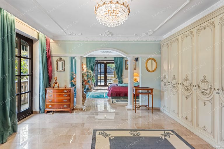A grand entrance hall opens into the impressive 76 m² living and dining salon, adorned with decorative stucco and featuring direct access to the terrace overlooking the expansive landscaped gardens.