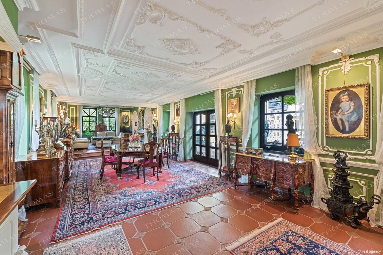 A grand entrance hall opens into the impressive 76 m² living and dining salon, adorned with decorative stucco and featuring direct access to the terrace overlooking the expansive landscaped gardens.