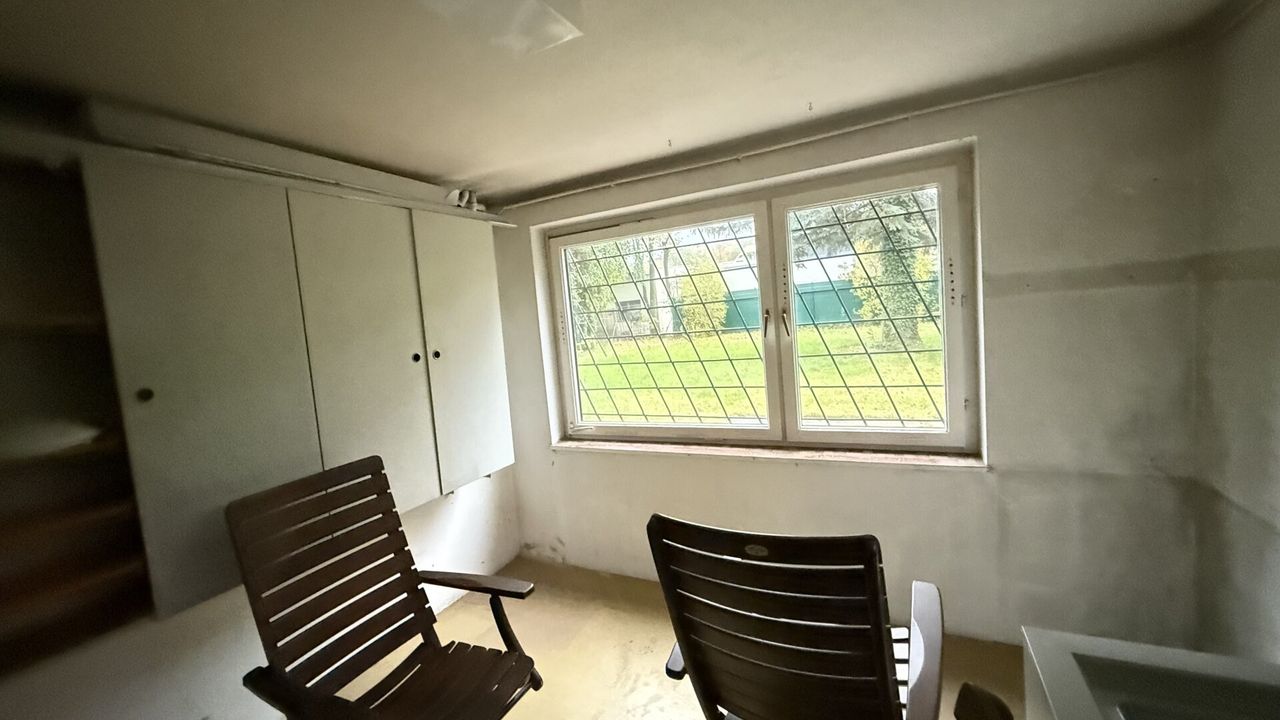 Im Erdgeschoss befindet sich die separat angelegte Küche, ein separates WC gleich beim Eingang, ein großes Wohnzimmer mit Zugang zum Balkon der in der herrlichen Garten blickt, ein Schlafzimmer, ein Windfang und das Vorzimmer, sowie eine schöne Holztreppe, welche nach oben und unten führt. Die Küche beinhaltet alle Geräte des täglichen bedarfs, ist jedoch schon eine ältere. Die Fenster sind zweifach verglast. Im Kellergeschoss sind Gitter an den Fenstern angebracht.
