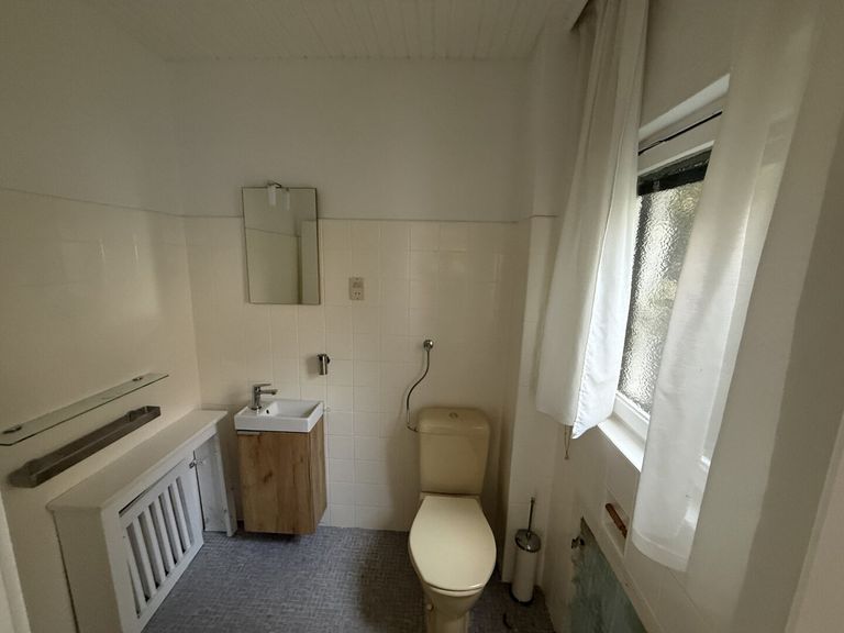 WC: Flachspülklosett mit Spülkasten, Sitzbrett mit Deckel.