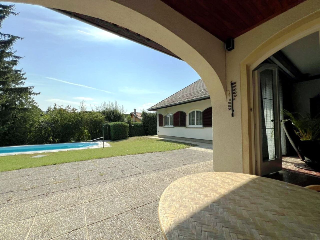 Geradeaus vom Eingangsbereich erreichen Sie über einen weiteren zentralen Vorraum die Küche und das Gäste-WC, welches aufgrund der Größe auch zu einem weiteren Badezimmer umgebaut werden könnte. Das gediegene Wohnzimmer befindet sich gleich danach und bietet eine große Sitzecke und einen Kachelofen, welcher aufgrund des Stils ein besonderes, gemütliches Ambiente erzeugt. Vom Wohnzimmer aus erreichen Sie durch 2 Terrassentüren die besonders großzügige, teilweise überdachte, Terrasse und in weiterer Folge den Garten und den Outdoorpool mit Schwimmbadüberdeckung. Nach dem Wohnzimmer gelangen Sie in ein weiteres mehr als 22m² großes Zimmer, welches auch als großzügiger Masterbedroom genutzt werden könnte. Das Dachgeschoss wurde teilausgebaut und bietet mit seinen 37m² eine eigene, kleine Wohnheit mit Badezimmer und Toilette, ideal als Bereich für die Jugend, Heimhilfe oder als Gästeeinheit. Weiters befindet sich auf dieser Ebene ein großzügiger Lagerraum mit Kühlung.