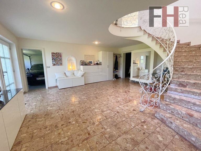 Sie betreten die Villa ebenerdig durch eine elegante, solide Sicherheitstür und befinden sich gleich im Vorraum mit Blick in das mehr als 20m² große Entree mit lichtdurchflutendem exklusiven Stiegenaufgang, jener durch wenige Stiegen zum Livingroom führt. Selbstverständlich können Sie auch über die großzügige Doppelgarage in die Diele kommen. In weiterer Folge kommt man durch eine doppelflügelige Glastüre zum absoluten Highlight der Liegenschaft, in den ca.43m² großen offenen Wohnsalon, einem eleganten Speiseraum mit weißem Kachelofen, einem Kaminzimmer mit Büro und einer voll- und bestens ausgestatteten Küche mit Markengeräten inkl. einer gemütlichen Frühstücksecke. Etwas separiert aber mit offenem Durchgang, befinden sich auf dieser Ebene auch die weiteren Zimmer wie Schlafzimmer, Bekleidungsraum, eventuelles Kinderzimmer und ein großzügiges Bad mit Regendusche, Badewanne etc. ebenso mit einem direkten Zugang zur Terrasse und in weiterer Folge zum Pool. Komplettiert wird diese Etage noch mit einem weiteren Zimmer und einer seperaten Toilette.