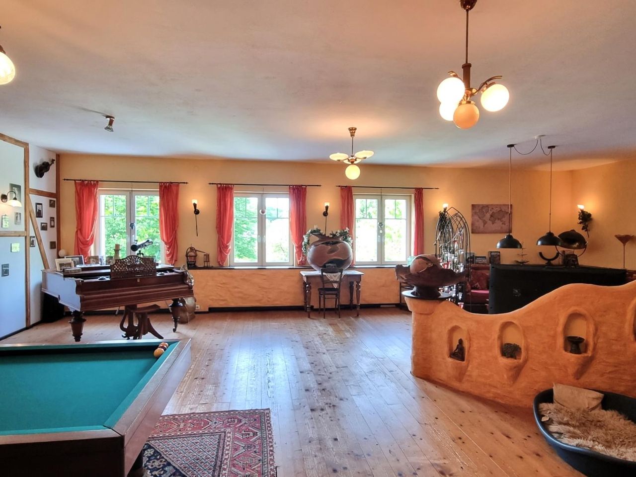 ERDGESCHOSS (ca. 247m²): Großzügiger, offener Wohn-Essbereich (ca. 105m²) mit anschließender Wohnküche (ca. 35m²) und überdachter SÜDTERRASSE, Vorraum, 2 Zimmer, Badezimmer mit Wanne und Dusche, 2 separates WC, 2 Waschküchen.