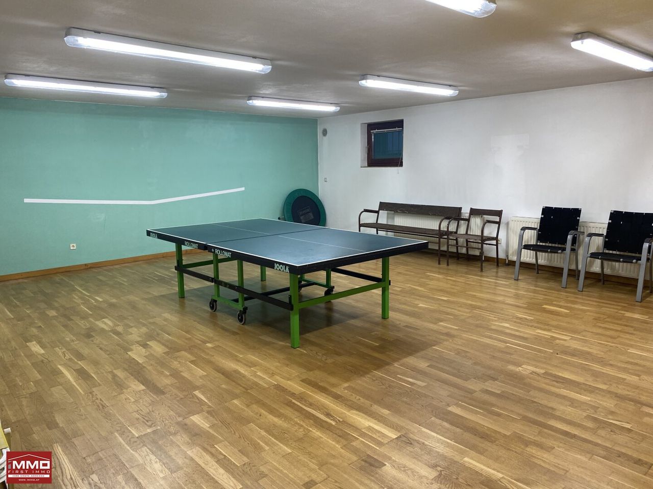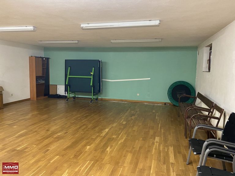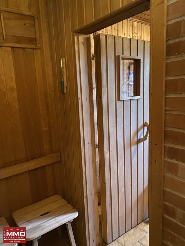 Das Haus ist voll unterkellert. Ein Seiteneingang führt vom Garten in einen kleinen Aufenthaltsraum, weiter zur Toilette und einer Umkleide mit Dusche. Eine elektrische Sauna von TYLO steht bereit. Waschküche mit Schwimmbadtechnik, Heizraum und Lagerraum befinden sich in diesem Teil des Kellers. Die Zentralheizung kann mit festen Brennstoffen oder Heizöl leicht befeuert werden. Im hinteren Teil des Kellers, jenseits des Stiegenaufgangs ins Erdgeschoß, ist der große Sportraum mit Tischtennistisch und Parkettboden untergebracht. Der Öllagerraum befindet sich unter dem Treppenhaus.