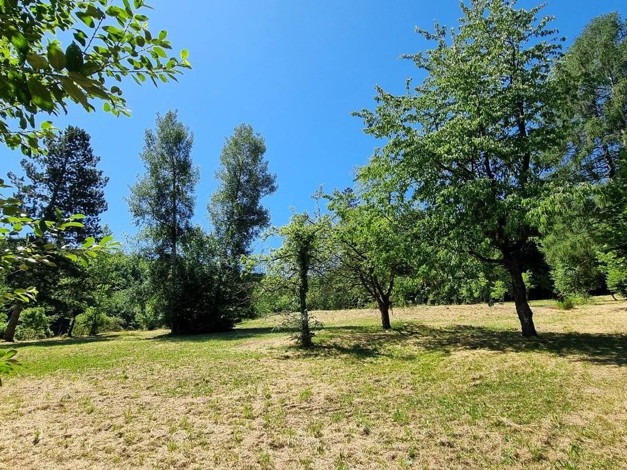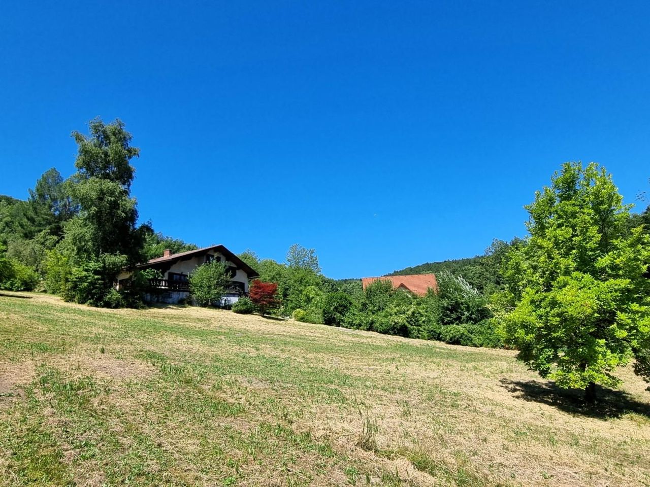 GARTEN: Großes SCHWIMMBIOTOP vorhanden; Mittlere Neigung, SONNIG, Strauch- und Altbaumbestand vorhanden.