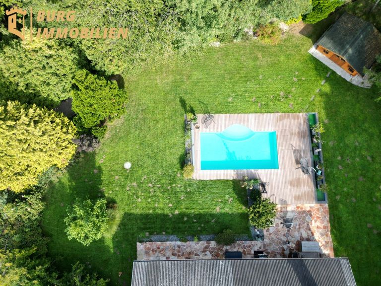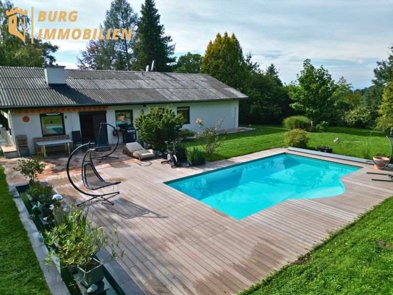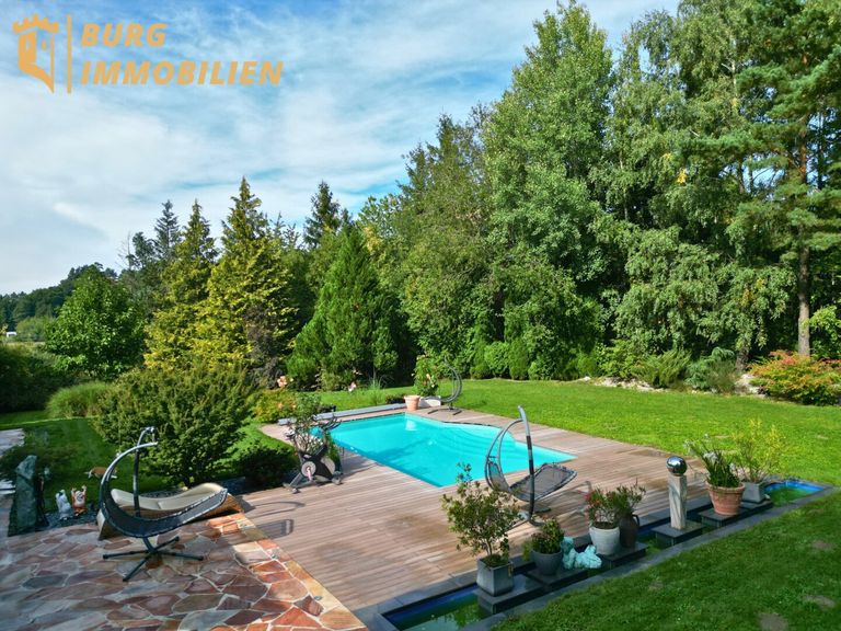 Der Grundbesitz verbindet Wald, Wiesen und Wasser zu einer stimmungsvollen Kulisse. Direkt beim Haus liegt der Zen-Pool mit sorgfältig ausgeführtem Pooldeck aus Holz – ein ruhiges Outdoor-Wohnzimmer auf der Gartenebene. Der Naturteich befindet sich deutlich vom Gebäude abgesetzt, im rückwärtigen, tieferliegenden Bereich der Liegenschaft; Oberhalb der Hausebene bietet eine zusätzliche Plateauebene romantische Blicke von oben auf Haus, Pool und den umgebenden Wald – ein eigener Rückzugsbereich für stille Momente.