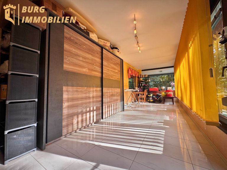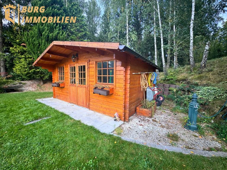 Aufgrund der erhöhten Lage gelangt man klassisch über eine Stiege auf das Haus- und Gartenplateau. Eine zweite Zufahrt führt direkt auf die Garten-/Pool-Ebene. Das separate Garagenhaus ist die einzige Garage am Areal, jedoch großzügig dimensioniert: Platz für zwei Fahrzeuge plus Abstell-/Lagerflächen. Darüber liegt ein Dachboden, der dank Niveauunterschied ebenerdig von der Gartenfläche betreten werden kann – praktisch und leicht zugänglich. Über einen Verbindungsgang gelangt man vom Garagenhaus durch den Keller trockenen Fußes direkt ins Wohnhaus.