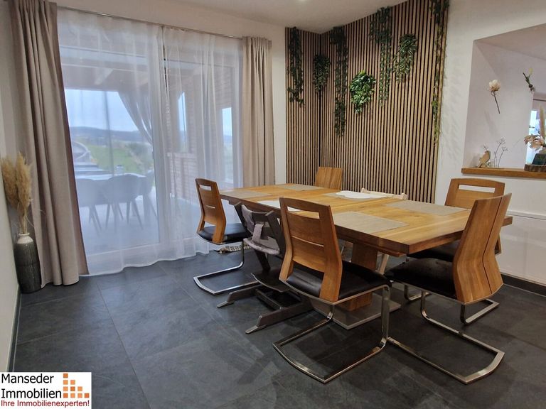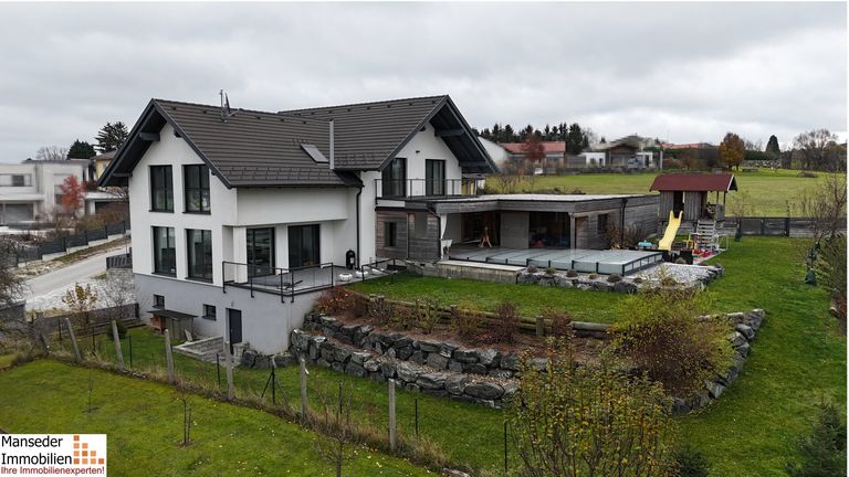 Schon beim Betreten dieses Haus spüren Sie den ausgesprochenen Charme dieser Perle am Immobilienmarkt. Mit einer großzügigen Wohnfläche von ca. 211 m² erfüllt dieses Haus hohe Ansprüche an Geräumigkeit und Lebensqualität. Neben dem geräumigen Vorraum stehen im Erdgeschoss das Wohnzimmer, die Küche mit Speis, ein Essbereich, ein zusätzliches Zimmer (hervorragend geeignet als Büro oder Gästezimmer), ein Dusche und ein WC zur Verfügung. Das Wohnzimmer bietet Ihnen viel Platz zum gemütlichen Wohnen und Genießen Sie über die toll platzierten Glasflächen einen schönen Weitblick. Von hier aus macht der Gang auf zwei Terrassen mit angeschlossenem tollen, hochwertigen 8 x 4 Meter großen Pool und einem Nebengebäude (welches Sie als Poolhaus benutzen können) so richtig Freude. Hier werden Sie an warmen Tagen so manch schöne Stunden im Kreise Ihrer Liebsten und Freunden verbringen. Den Begriff Work-Life-Balance werden Sie hier neu zu definieren wissen. Nach einem anstrengenden Tag findet man in ausgesprochen gemütlicher Atmosphäre zur Ruhe. Auch so manche Home-Office-Arbeit lässt sich hier leichter erledigen und werden Sie dadurch Ihre Arbeit wie Freizeitvergnügen erleben.
