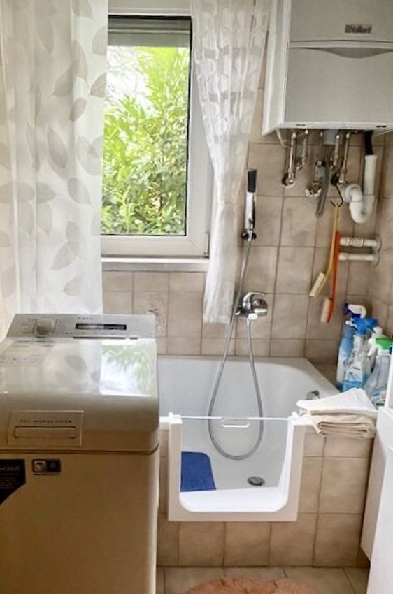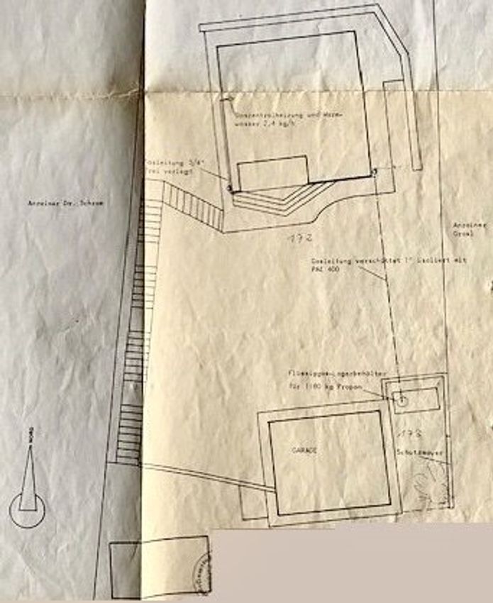 Heizung und Warmwasser über Flüssiggas-Zentralheizung. Gastank.