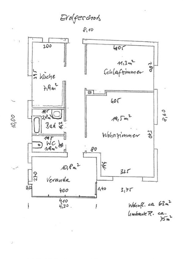 Wohnfläche Erdgeschoß ca. 63 m2. Gesamtgrundfläche 2.815 m2 (davon 111 m2 Baufläche, 1.415 m2 Gärten, 1.289 m2 landwirtschaftliche Fläche).