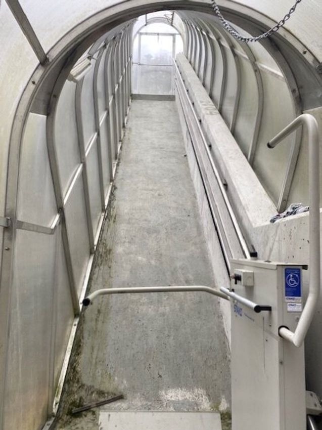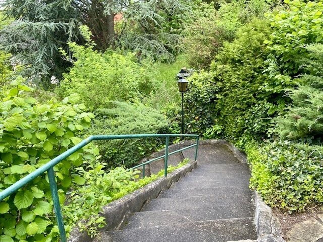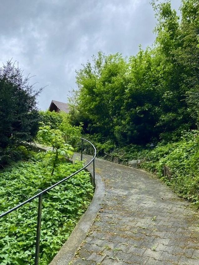 Es gibt drei Aufgänge zum Haus: eine Stiege auf der einen, einen gepflasterten, mit Kleingeräten befahrbaren Weg auf der anderen Seite, sowie einen überdachten Schrägaufzug für Personen und auch Lasten-Beförderung.