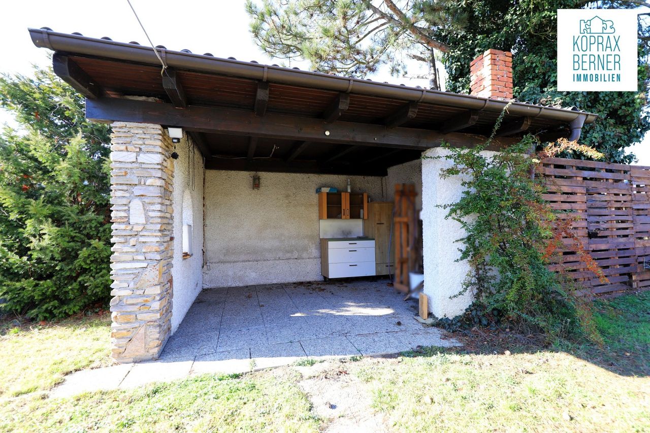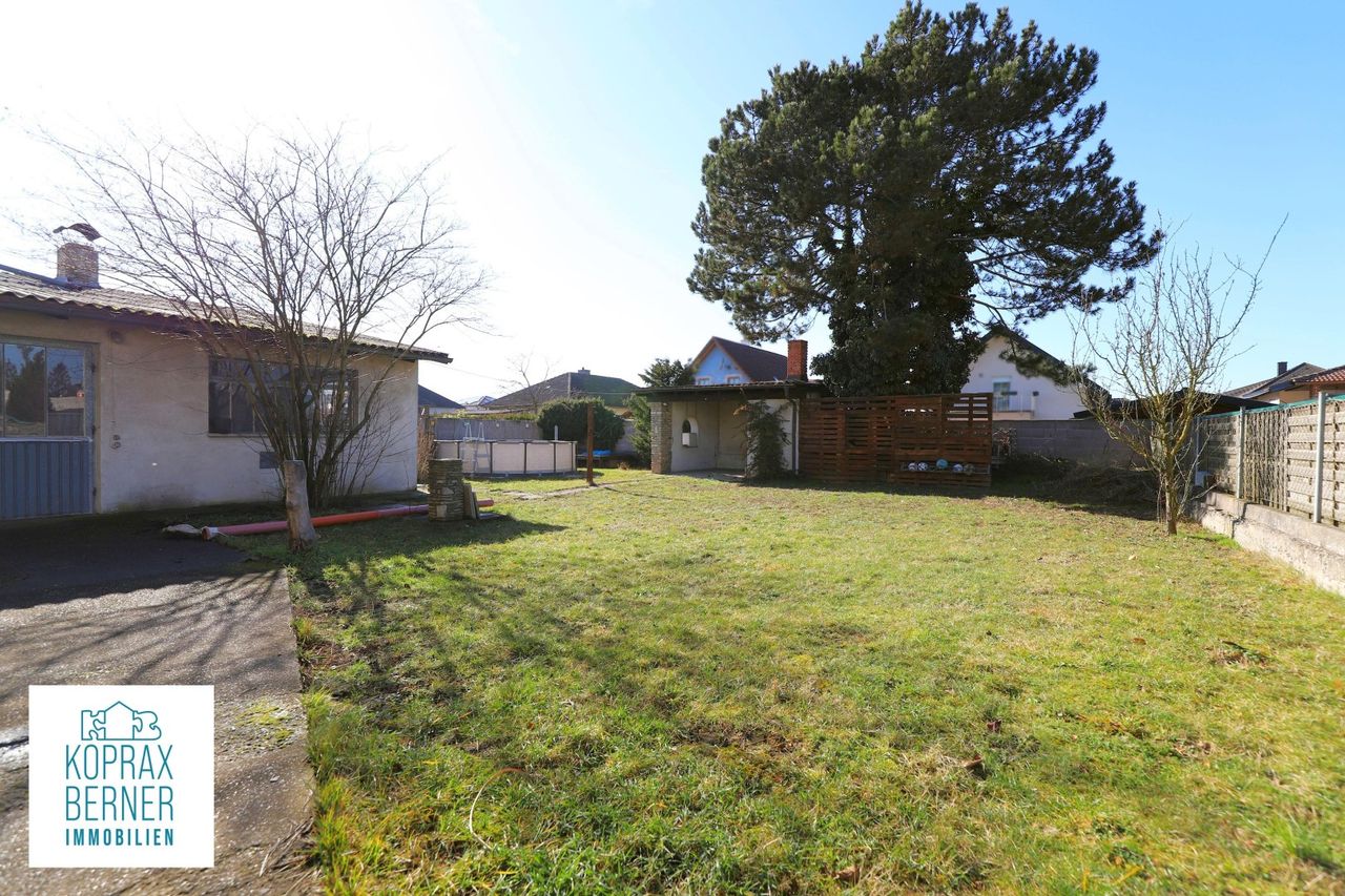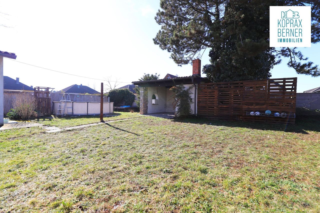 Im großen ebenen Garten stehen ein kleiner aufgestellter Pool, sowie eine Gartenlaube mit gemauertem Griller für gemütliche Stunden zur Verfügung.