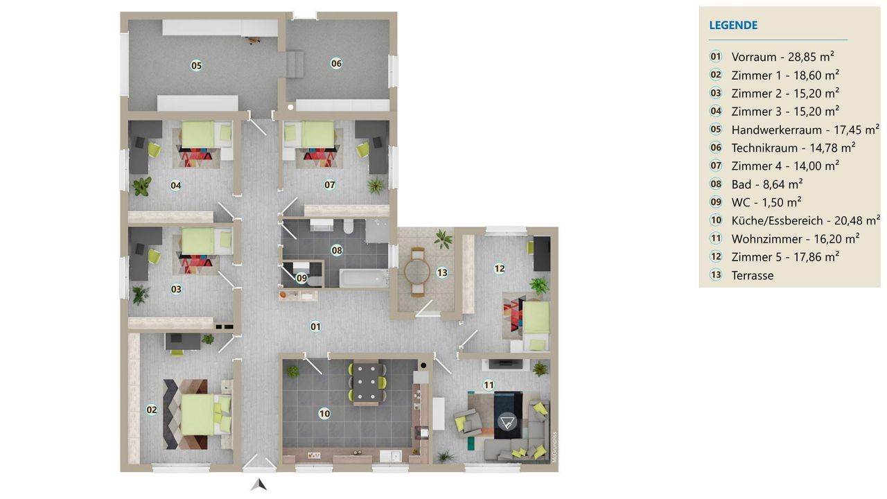 Das Haus überzeugt durch seine großzügigen, lichtdurchfluteten Räume und eine durchdachte Raumaufteilung. Der offene Küchen- und Essbereich bildet das Herzstück des Hauses und schafft einen zentralen Ort für das tägliche Leben. Fünf individuell nutzbare Zimmer bieten flexible Gestaltungsmöglichkeiten für Wohnen, Arbeiten oder Freizeit. Das moderne Badezimmer sowie ein separates Gäste-WC entsprechen höchsten Wohnstandards. Ergänzt wird die Ausstattung durch einen Technik- und Handwerkerraum, zusätzlich befinden sich im Nebengebäude 3 große Lagerräume.