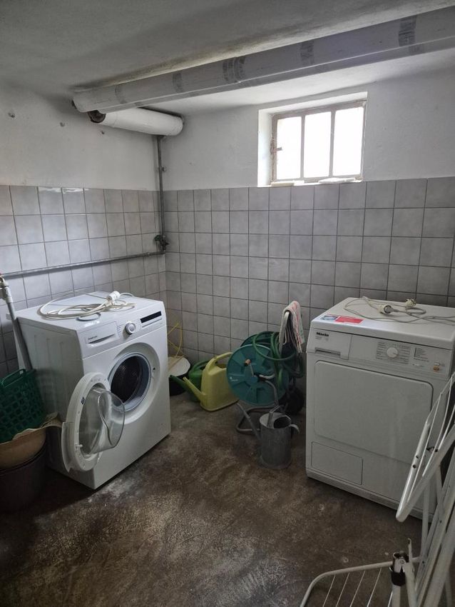 Unter anderem befindet sich im Keller ein Waschraum der Platz für Waschmaschine und Trockner bietet. Durch einen eigenen Ausgang im Keller gelangt man direkt in den Garten.