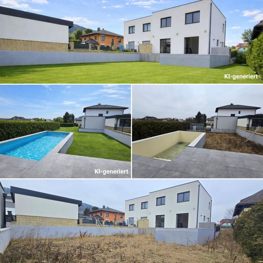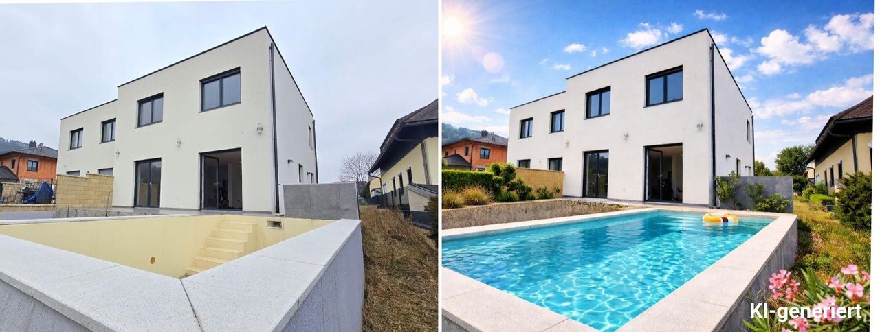 Diese hochwertige Doppelhaushälfte in Reichersdorf überzeugt durch moderne Architektur, energieeffiziente Bauweise und ein durchdachtes Raumkonzept mit großzügigen, lichtdurchfluteten Flächen. Das Haus wurde in massiver 45 cm Ytong-Bauweise errichtet und erfüllt höchste Ansprüche an Energieeffizienz, Wohnkomfort und Nachhaltigkeit. Große 3-fach-verglaste Fenster in allen Räumen sowie eine Raumhöhe von ca. 2,60 m sorgen für ein außergewöhnlich offenes und helles Wohngefühl. Das Flachdach unterstreicht die moderne Architektur und ist mit einer leistungsstarken Photovoltaikanlage ausgestattet. In Kombination mit der Wärmepumpe profitieren Sie von niedrigen Energiekosten und einer zukunftssicheren Heiztechnik. Ein besonderes Highlight ist der direkt angrenzende 3 x 6 m große Pool – von...