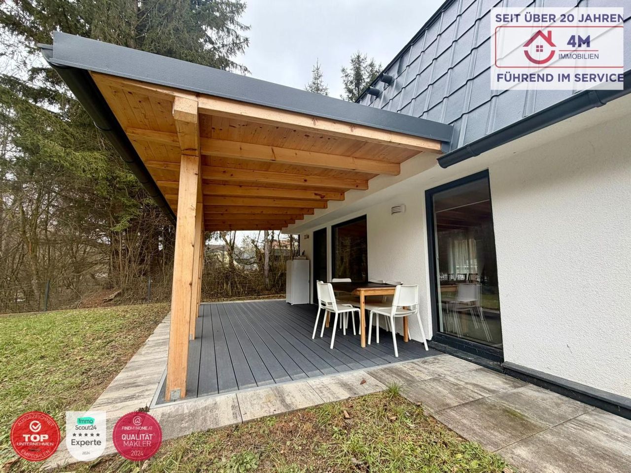 Großzügige, überdachte Terrasse mit Blick ins Grüne