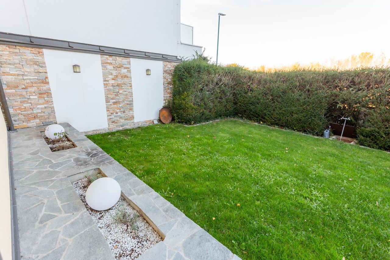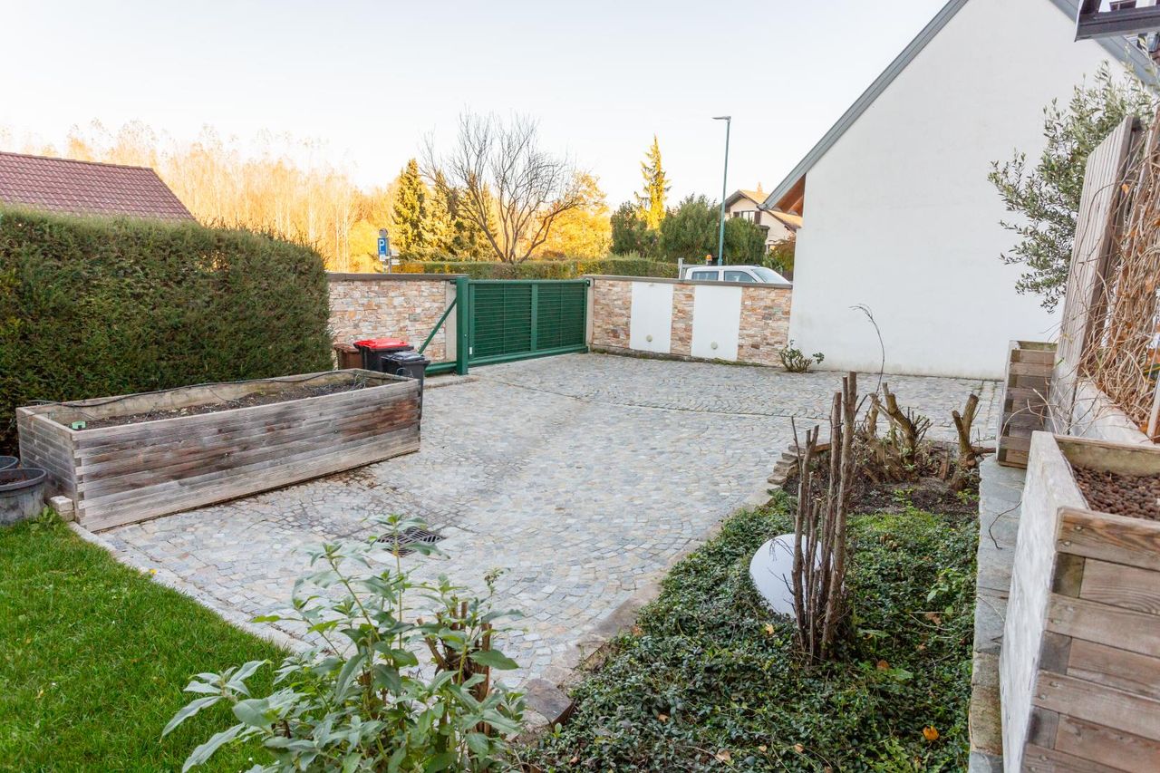 Eine kleine Grünfläche sorgt für ein natürliches Ambiente, ohne hohen Pflegeaufwand zu erfordern. Die Terrasse mit Beschattung lädt zum Entspannen und Verweilen im Freien ein – ideal für sonnige Tage. Insgesamt ist die Außenanlage funktional, stilvoll und auf eine pflegeleichte Nutzung ausgelegt.