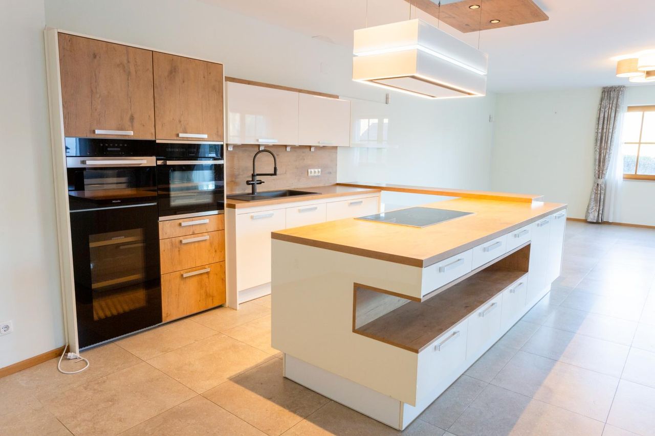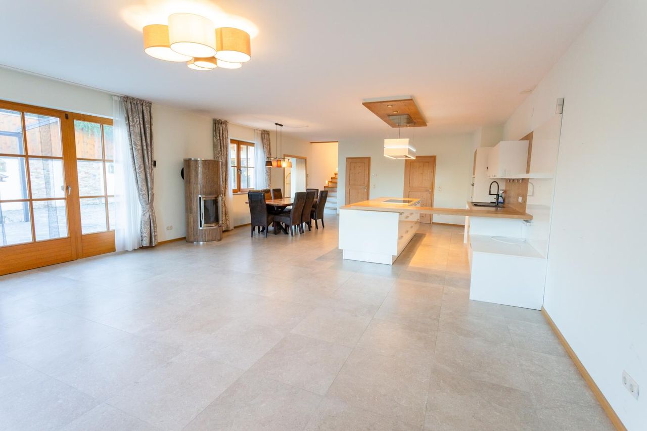 - Eine Wohnküche (ca. 68 m²) – top moderne Einbauküche, Kamin, Zugang auf die Terrasse