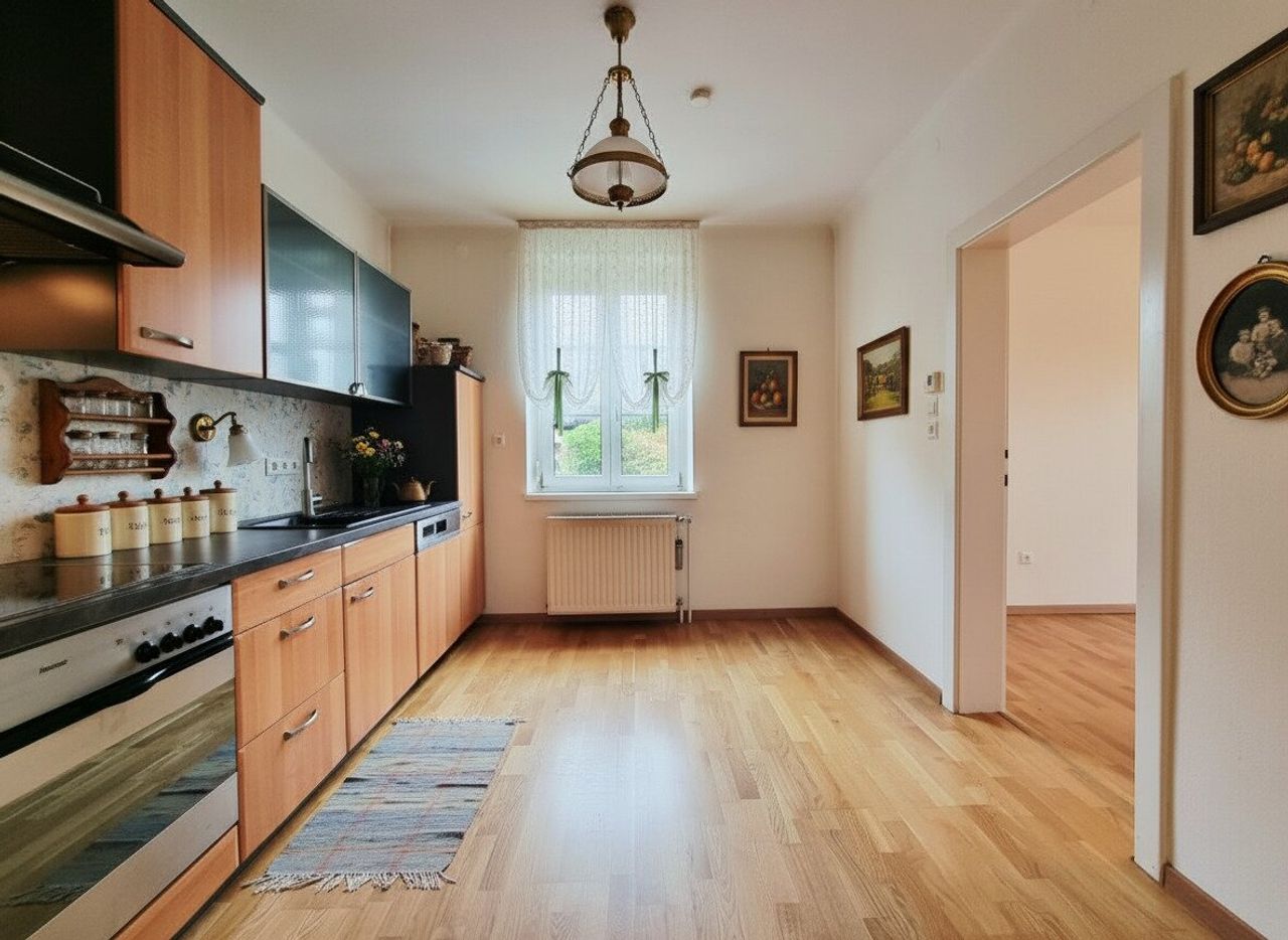 Raumprogramm: Das Erdgeschoss empfängt mit einem Windfang und Vorzimmer, einem gemütlichen Wohnzimmer, einem zusätzlichen Zimmer, einer Küche sowie einem Gäste-WC. Ein praktischer Wirtschafts- bzw. Abstellraum ergänzt das Raumangebot. Das zentral gelegene Treppenhaus verbindet alle Ebenen, vom Keller über das Obergeschoss bis hin zum Dachboden. Im Obergeschoss erwarten Sie ein zentraler Flur, drei helle Zimmer sowie ein großzügiges Tageslichtbad mit Badewanne, Dusche und WC