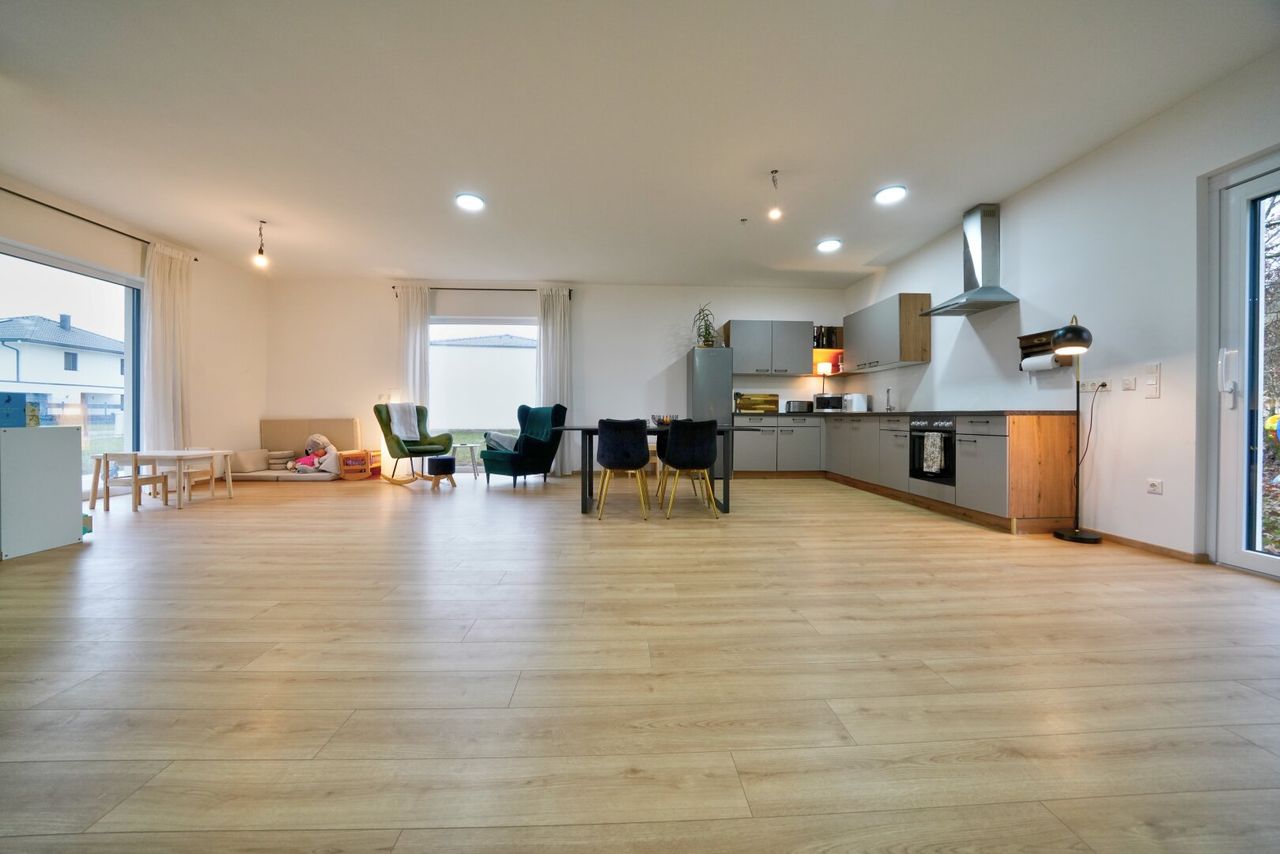 Das Herzstück des Hauses bildet der offen gestaltete Wohn- und Essbereich. Hier genießen Sie gemeinsame Stunden mit Familie und Freunden. Die großzügigen Fensterflächen sorgen für viel Tageslicht und schaffen eine angenehme, einladende Wohnatmosphäre.