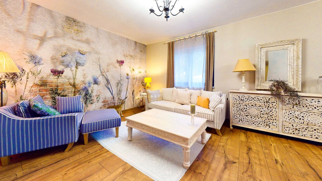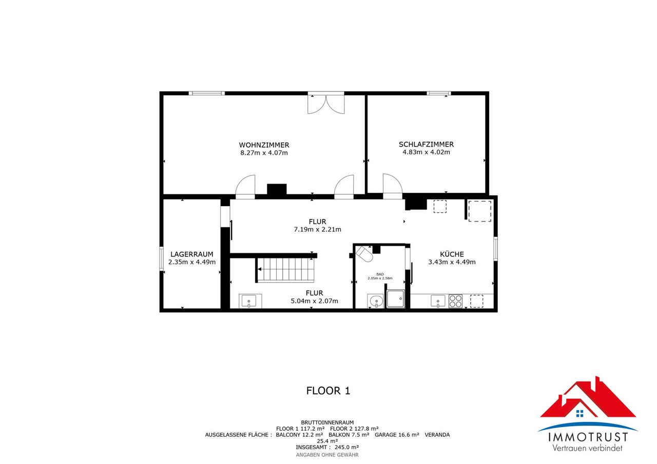 Mit einer Wohn- und Nutzfläche von insgesamt rund 244,9 m² auf zwei Ebenen bietet das Haus ein außergewöhnlich großzügiges Raumangebot. Im Obergeschoss mit ca. 127,8 m² befinden sich mehrere angenehm geschnittene Wohn- und Schlafräume, eine Küche mit praktischer Speisekammer, ein Badezimmer mit Dusche sowie ein separates WC. Diese Ebene vermittelt ein klassisches, wohnliches Ambiente und bietet ideale Voraussetzungen für den täglichen Familienalltag. Zusätzlich erweitern die beiden Balkone mit ca. 12,2 m² und 7,5 m² den Wohnraum ins Freie und schaffen schöne Plätze zum Entspannen.