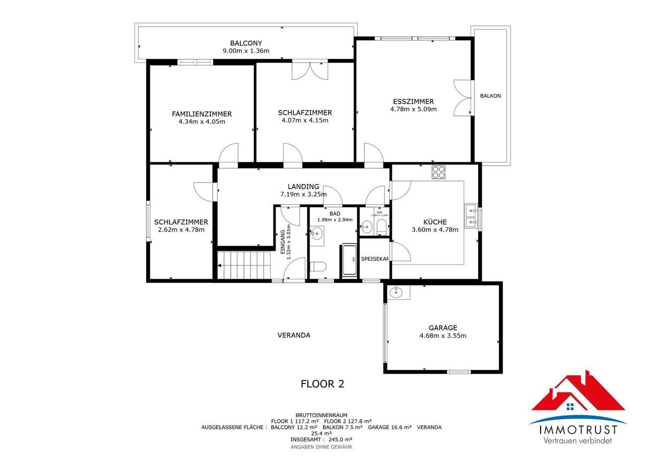 Mit einer Wohn- und Nutzfläche von insgesamt rund 244,9 m² auf zwei Ebenen bietet das Haus ein außergewöhnlich großzügiges Raumangebot. Im Obergeschoss mit ca. 127,8 m² befinden sich mehrere angenehm geschnittene Wohn- und Schlafräume, eine Küche mit praktischer Speisekammer, ein Badezimmer mit Dusche sowie ein separates WC. Diese Ebene vermittelt ein klassisches, wohnliches Ambiente und bietet ideale Voraussetzungen für den täglichen Familienalltag. Zusätzlich erweitern die beiden Balkone mit ca. 12,2 m² und 7,5 m² den Wohnraum ins Freie und schaffen schöne Plätze zum Entspannen.
