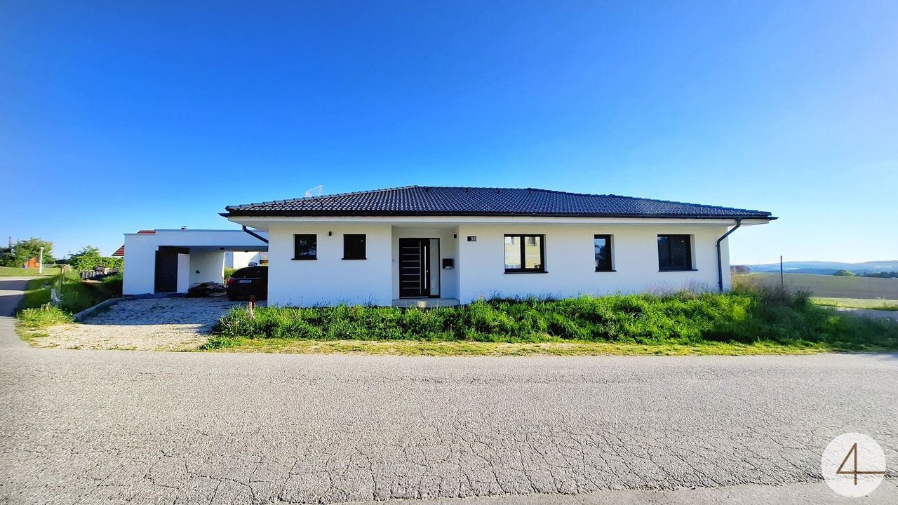 Schlüsselfertiger Bungalow mit gepflasterter Einfahrt, großer Terrasse und sparsamer Luftwärmepumpe.