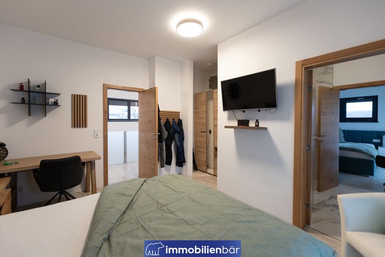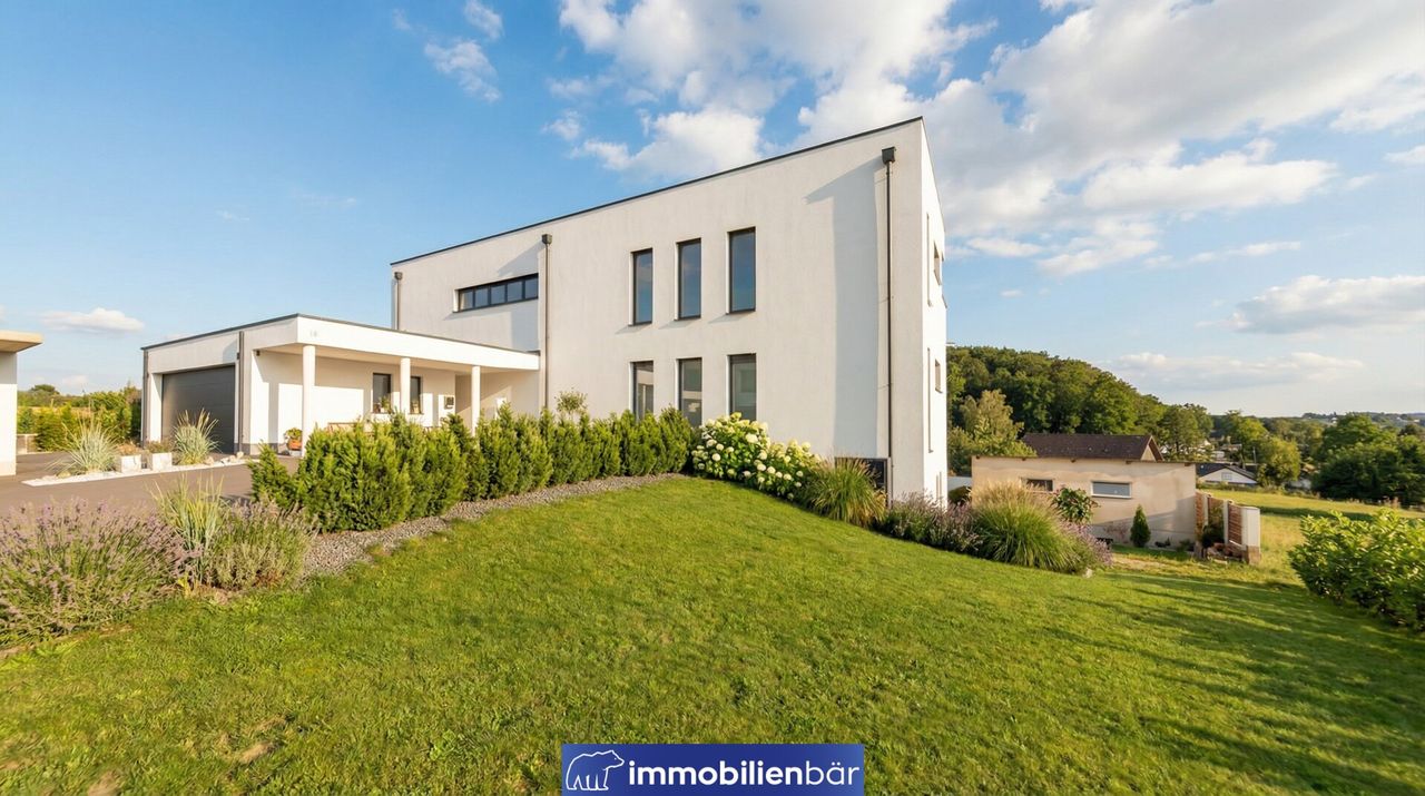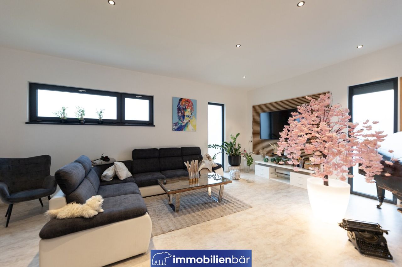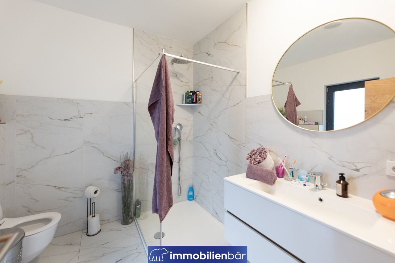 Auch technisch überzeugt die Villa Marie auf ganzer Linie. Das besondere Magu-Bausystem mit Beton und Styroporschallsteinen sorgt für hervorragende Stabilität, Dämmung, ein angenehmes Raumklima. Beheizt wird das Niedrigenergiehaus nachhaltig über eine moderne Luftwärmepumpe in Kombination mit einer komfortablen Fußbodenheizung – für wohlige Wärme in jedem Raum. Ein weiteres Highlight befindet sich im Untergeschoss: ein eigenes Hallenbad.