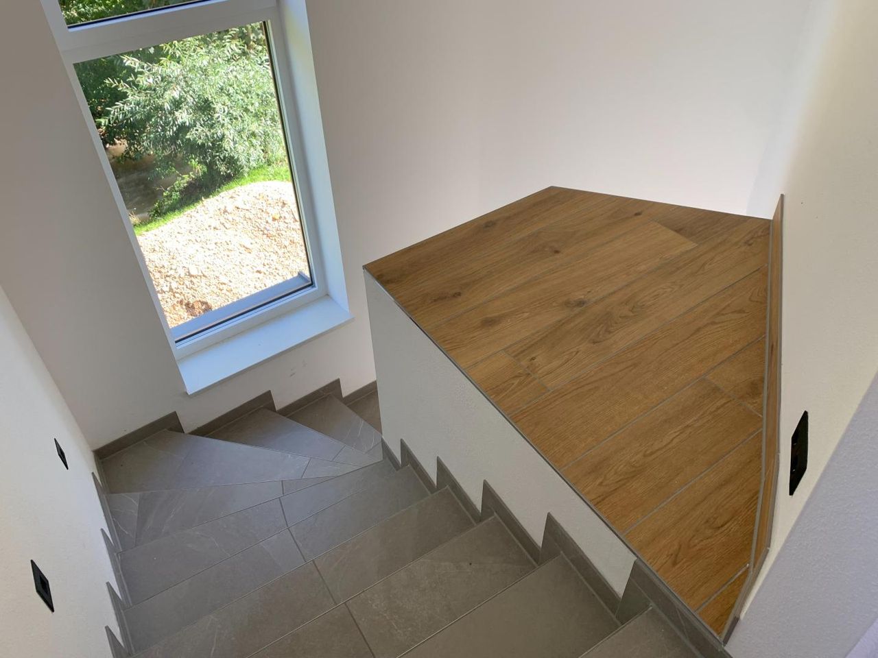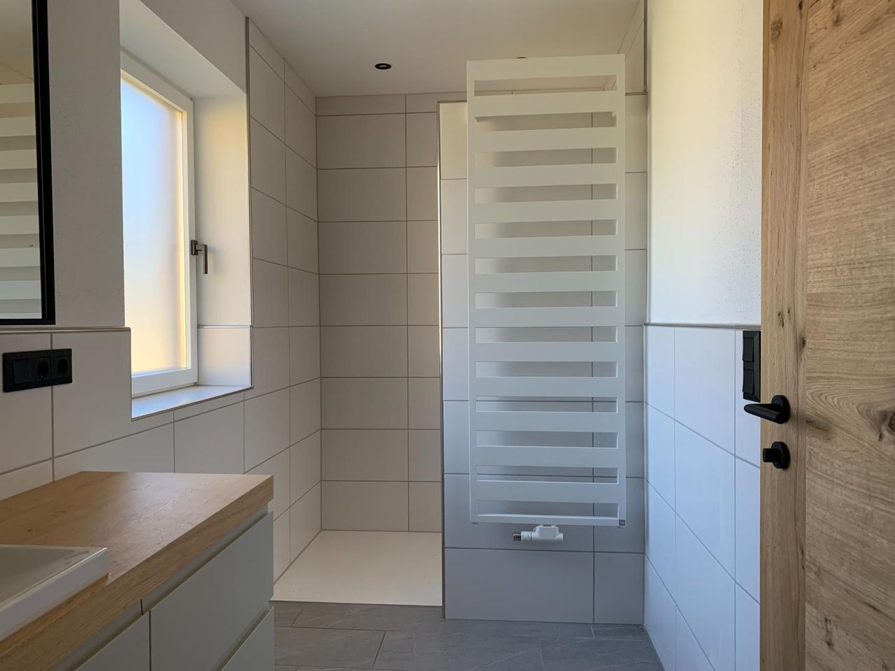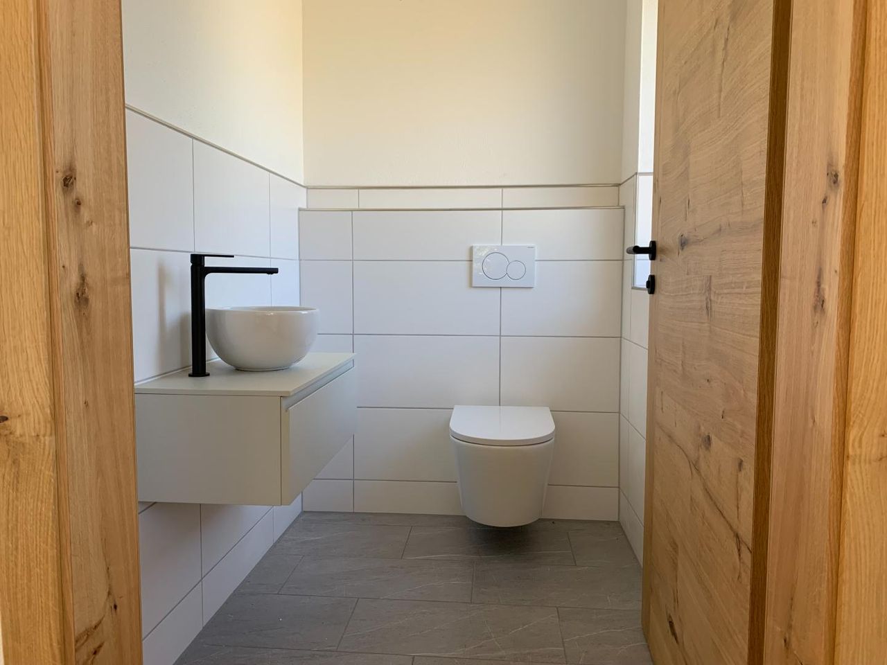 Im Obergeschoss befinden sich neben dem offenen Wohnbereich zwei weitere Zimmer, die sich als Schlafzimmer, Kinderzimmer oder Büro nutzen lassen. Das Badezimmer ist mit einer Badewanne, einer Dusche und modernen Armaturen ausgestattet. Außerdem bietet ein separates WC zusätzlichen Komfort. Die Fußbodenheizung, die über eine effiziente Luftwärmepumpe betrieben wird, sorgt im gesamten Obergeschoss für angenehme Temperaturen und ein behagliches Wohnklima. Die räumliche Anordnung ist sehr durchdacht und optimal auf die Bedürfnisse kleiner Familien oder Paare abgestimmt.