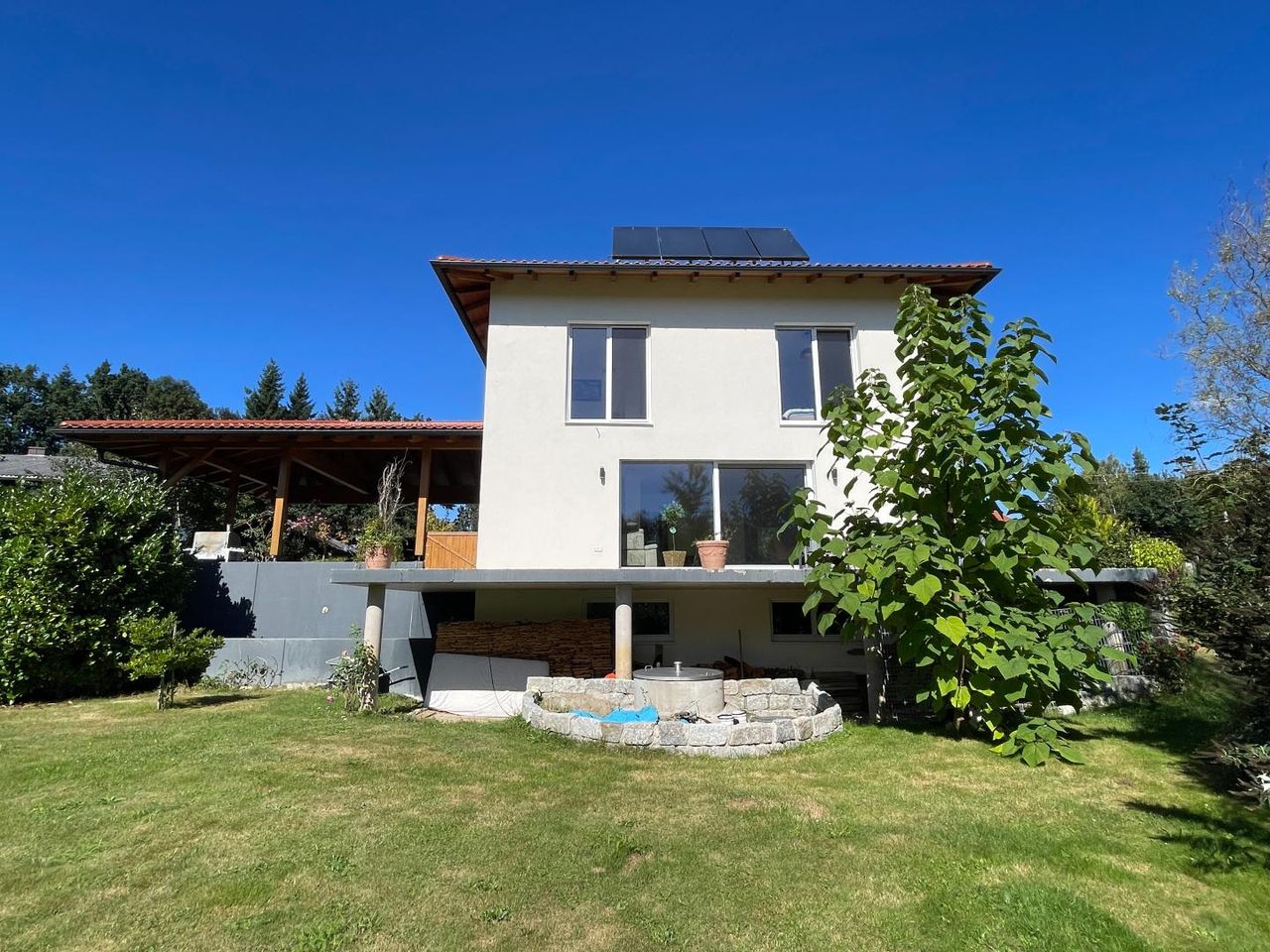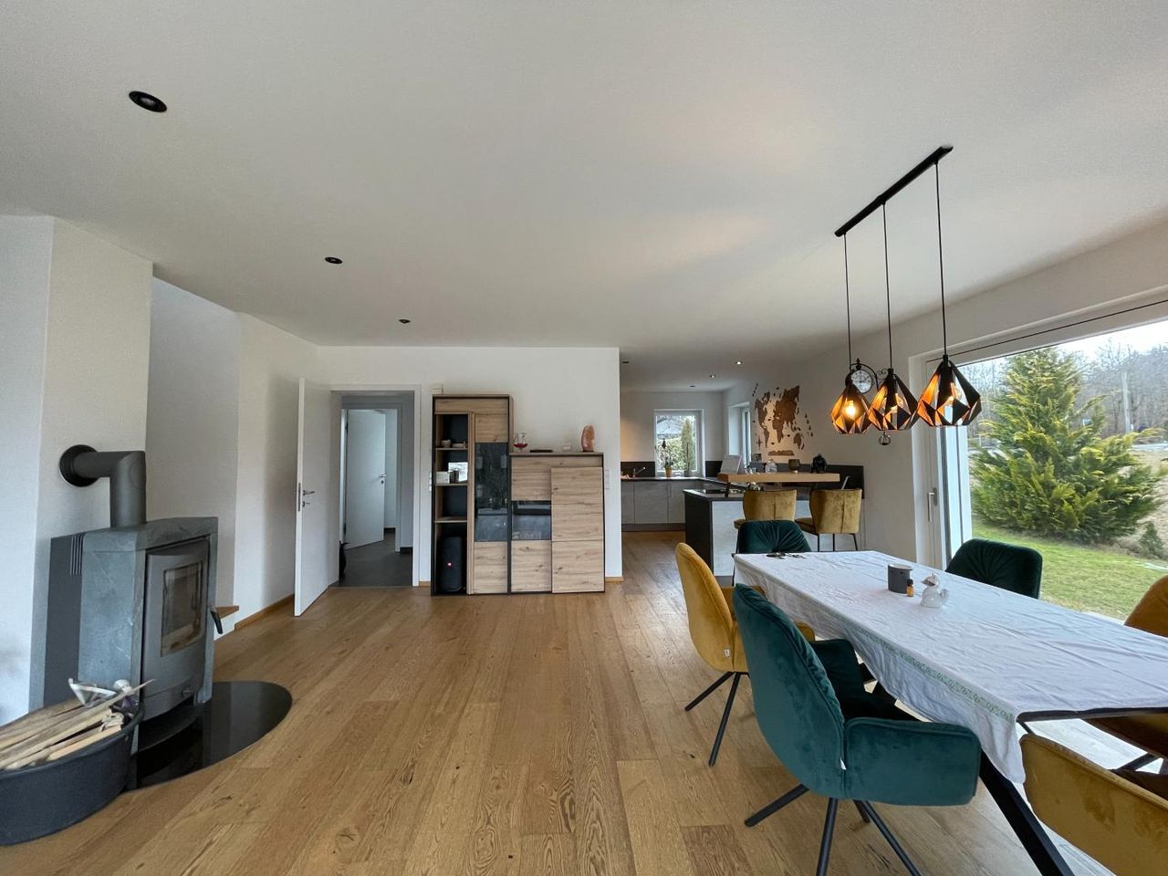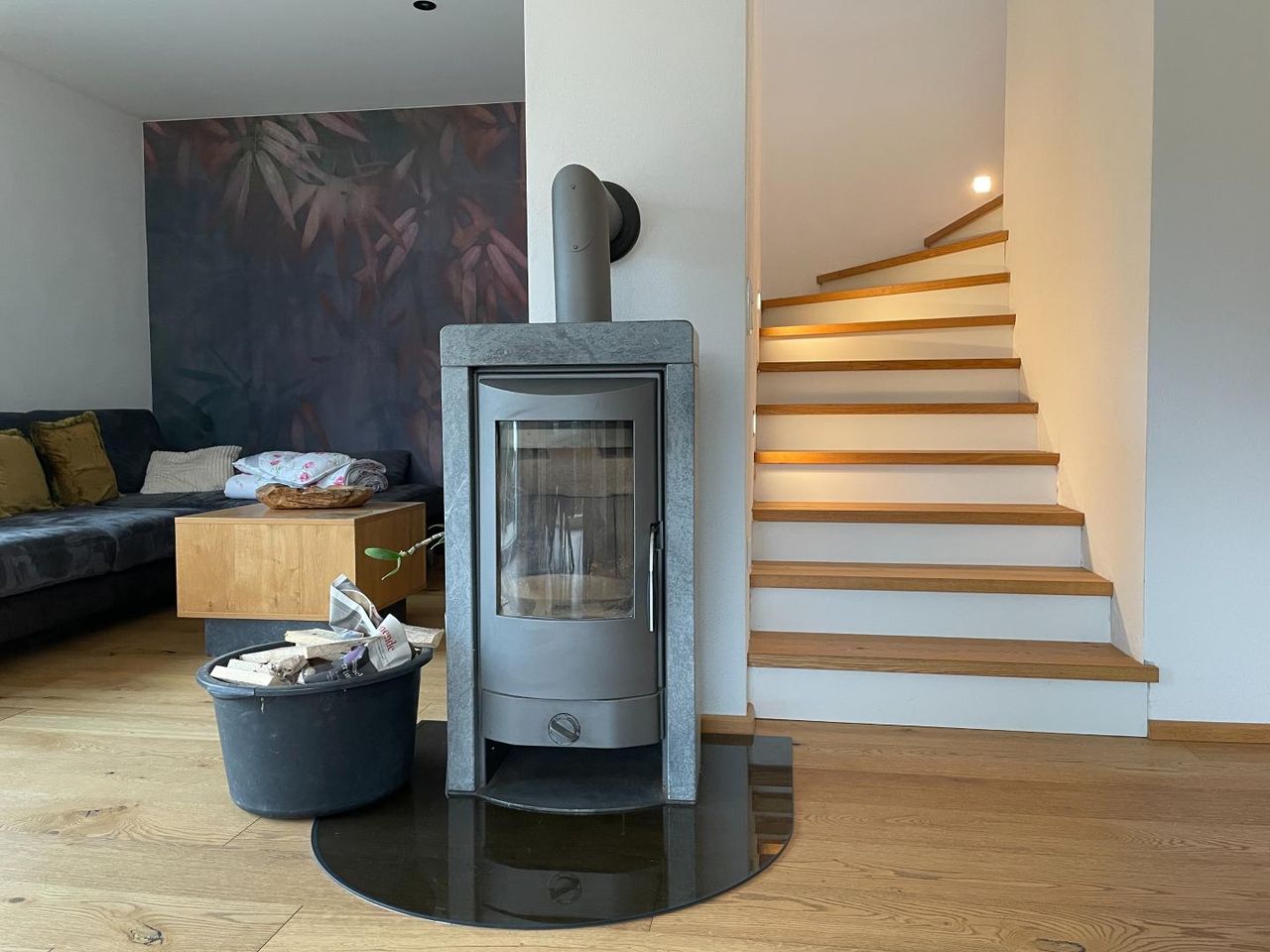 Für wohlige Wärme sorgt eine moderne Luftwärmepumpe in Kombination mit Fußbodenheizung. Ergänzt wird das nachhaltige Energiekonzept durch eine Solaranlage zur Warmwasseraufbereitung. An kühleren Tagen schafft der zusätzliche Schwedenofen eine besonders gemütliche Atmosphäre und unterstreicht den Wohnkomfort.