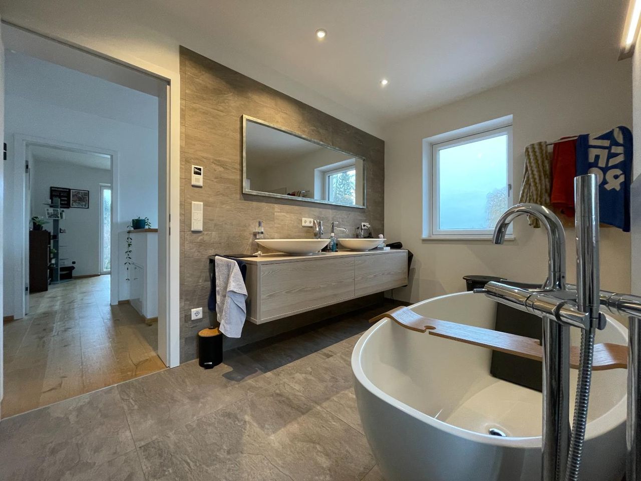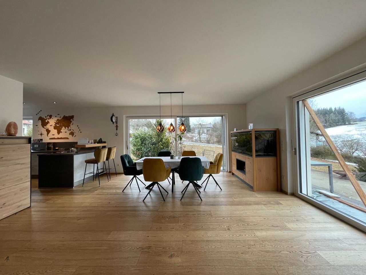 Bereits beim Betreten des Hauses spürt man die helle, freundliche Atmosphäre. Große Fensterflächen mit Dreifachverglasung sorgen für lichtdurchflutete Räume und ein angenehmes Wohnklima. Im Wohnbereich bieten moderne Raffstores zusätzlichen Komfort und flexible Beschattung. Herzstück des Hauses ist der offen gestaltete Wohn- und Essbereich mit direktem Zugang zur sonnigen Terrasse und in den weitläufigen Garten – ein perfekter Ort für entspannte Stunden im Freien.