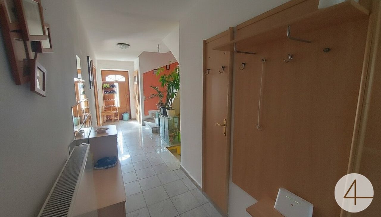 Das Gebäude wurde 1998 auf dem Platz eines alten Bauernhauses neu errichtet und immer sehr gepflegt. Die "Hauptwohnung" misst ca. 140m² aufgeteilt auf 2 Stockwerke. Im Erdgeschoss betreten Sie das Haus durch den schönen verglasten Vorbau, welcher die Erscheinung eines Wintergartens hat. Am langgezogenen Vorraum grenzen, die großzügige Essküche mit einem offenen Wohnzimmer sowie das Gäste WC und das mit zeitlos hellen Fliesen ausgestattete, offen gehaltene Treppenhaus.