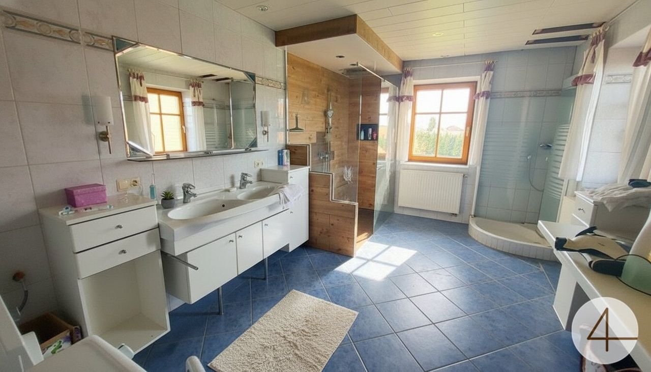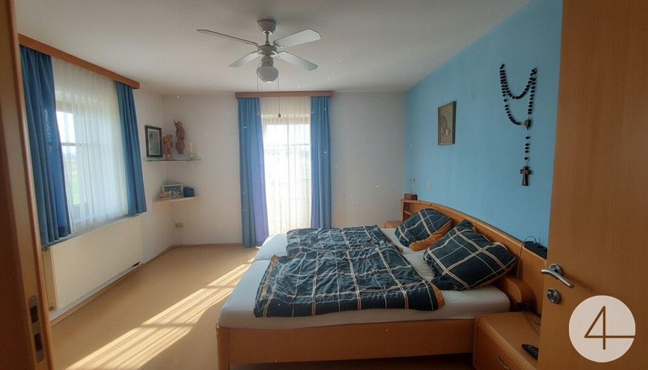 Über das Treppenhaus gelangen Sie in den Keller (wo sich der Technikraum und eine kleine Kellerbar, sowie ein alter Keller vom ehemaligen Hof befinden) und in das Obergeschoss der Liegenschaft, welches über ein sehr großzügiges Badezimmer, 3 schöne helle Schlafräume mit Zugang zum Balkon sowie über ein separiertes WC und den Aufgang auf den Dachboden verfügt.