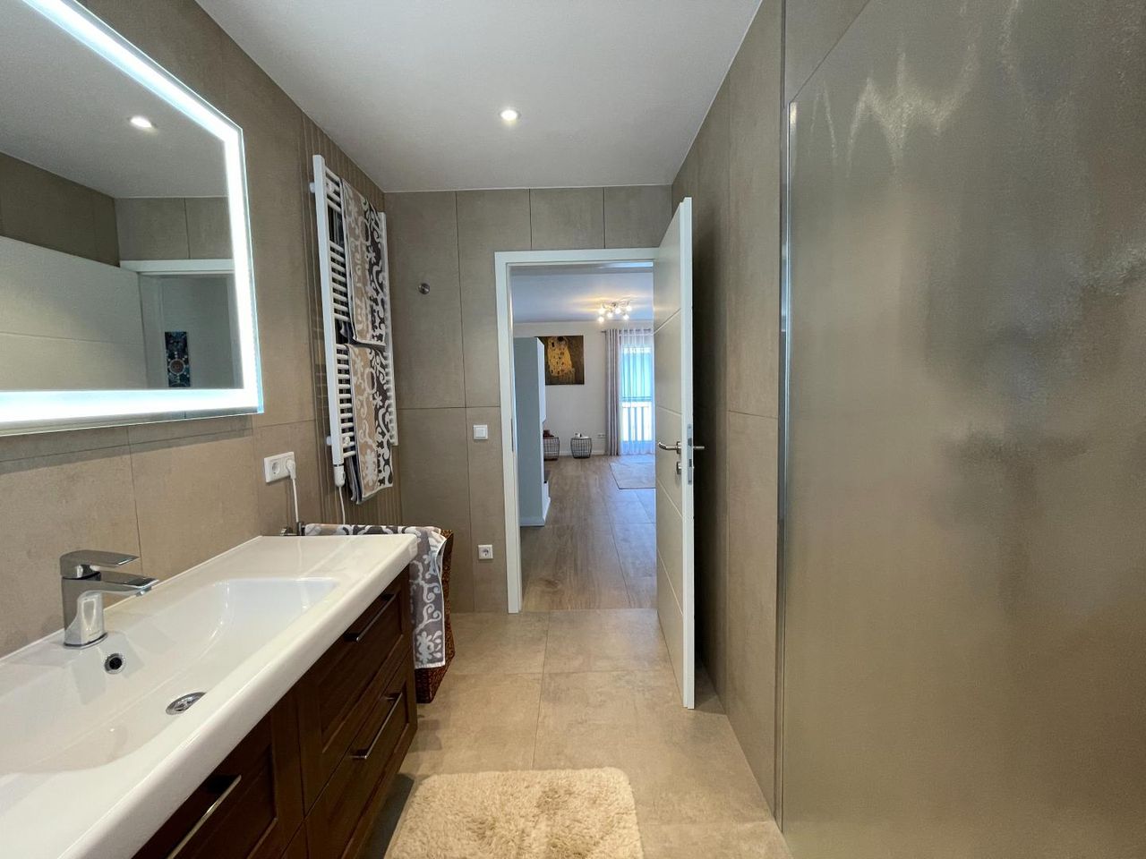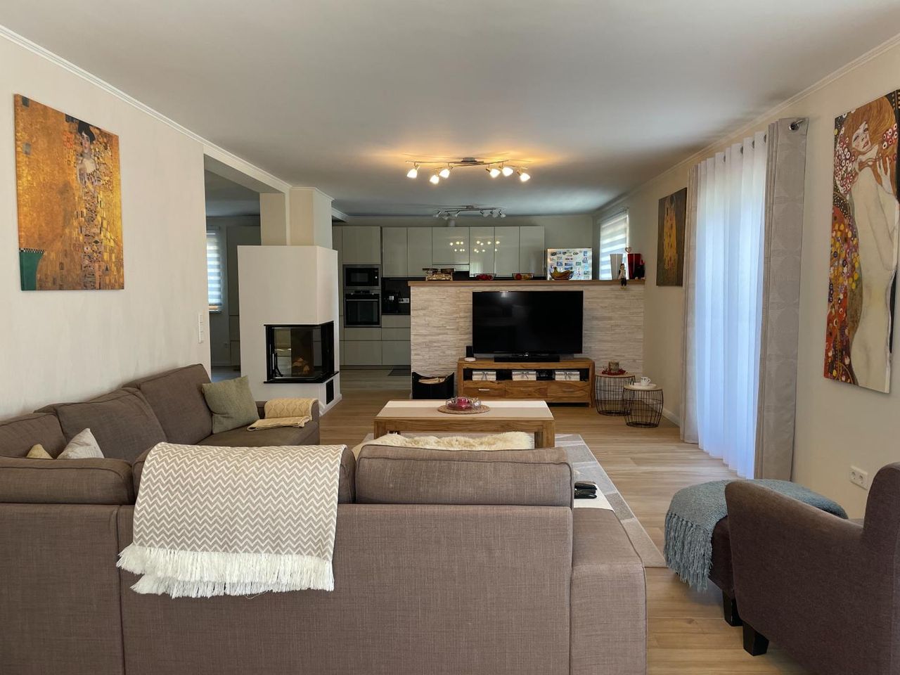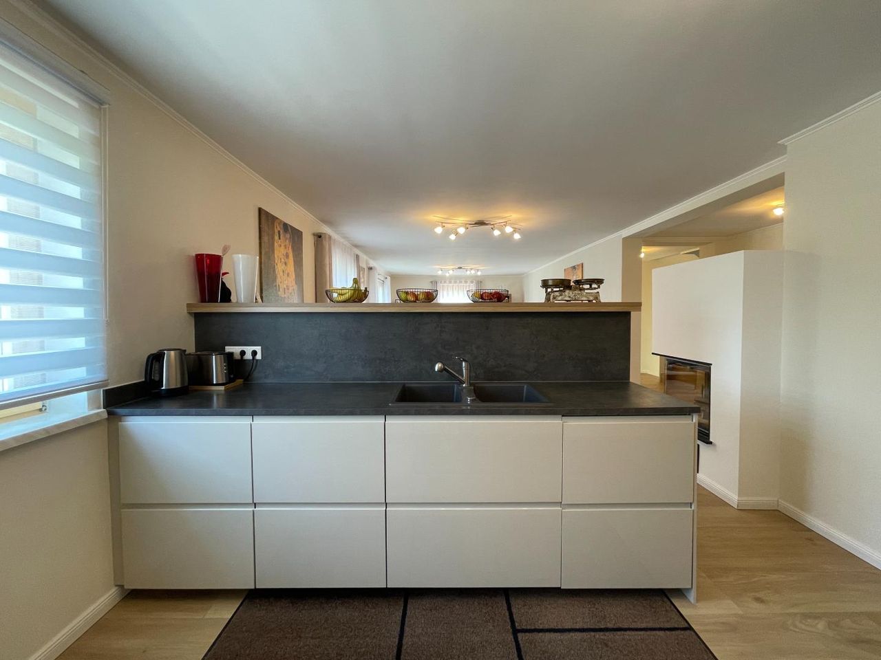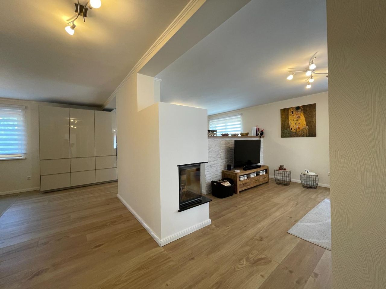 Hier liegt der zentrale Wohnbereich mit Zugang zum sonnigen Balkon. Eine moderne, großzügige Küche mit integriertem Essbereich lädt zum Verweilen ein. Das gemütliche Wohnzimmer ist mit einem Kamin ausgestattet, der für behagliche Atmosphäre sorgt. Ebenfalls im Obergeschoss befinden sich das Schlafzimmer, ein stilvoll ausgestattetes Badezimmer sowie ein separates WC.