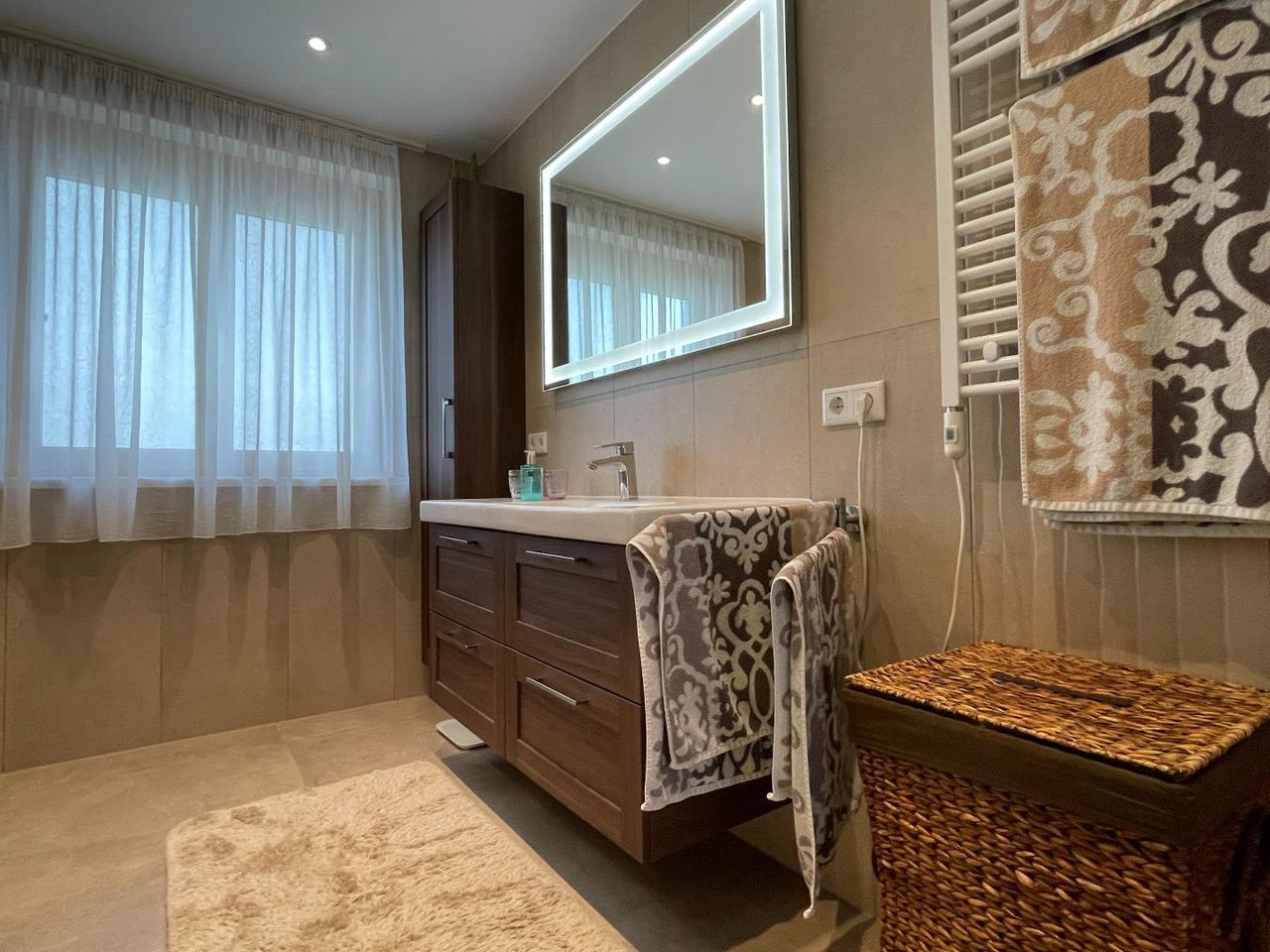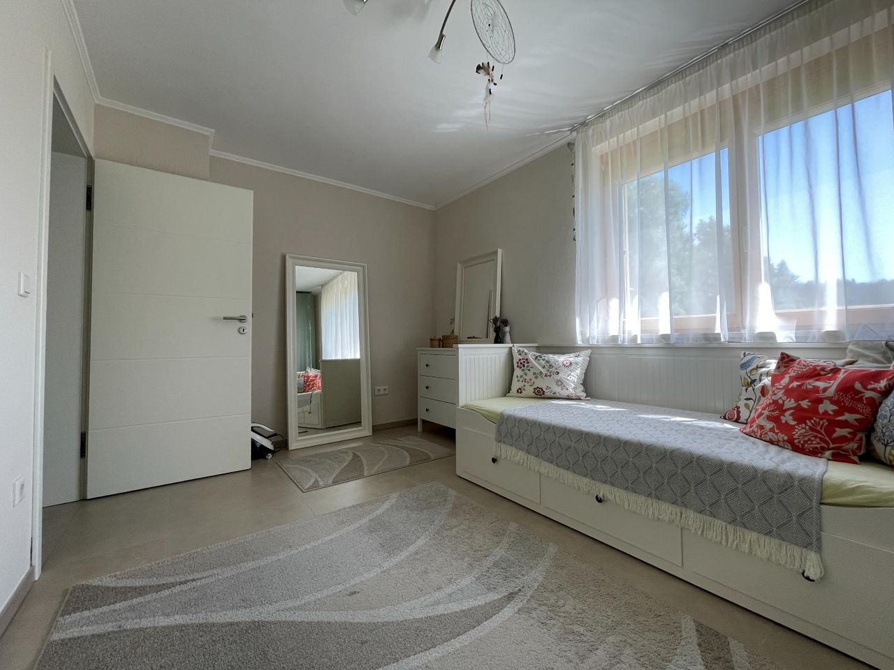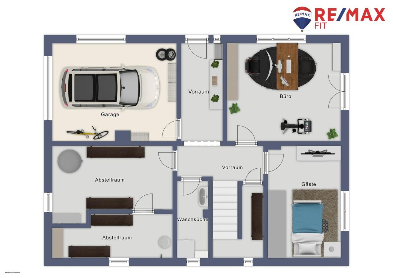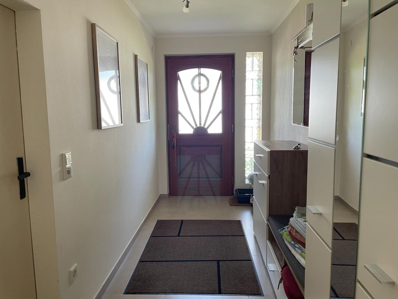 Direkt neben dem Hauseingang befindet sich die großzügige Garage sowie ein Technik- bzw. Lagerraum. Zudem bietet das Erdgeschoss ein Gästezimmer sowie ein Büro mit direktem Zugang zur Terrasse bzw. zum Garten – ideal für Homeoffice oder als Rückzugsort.