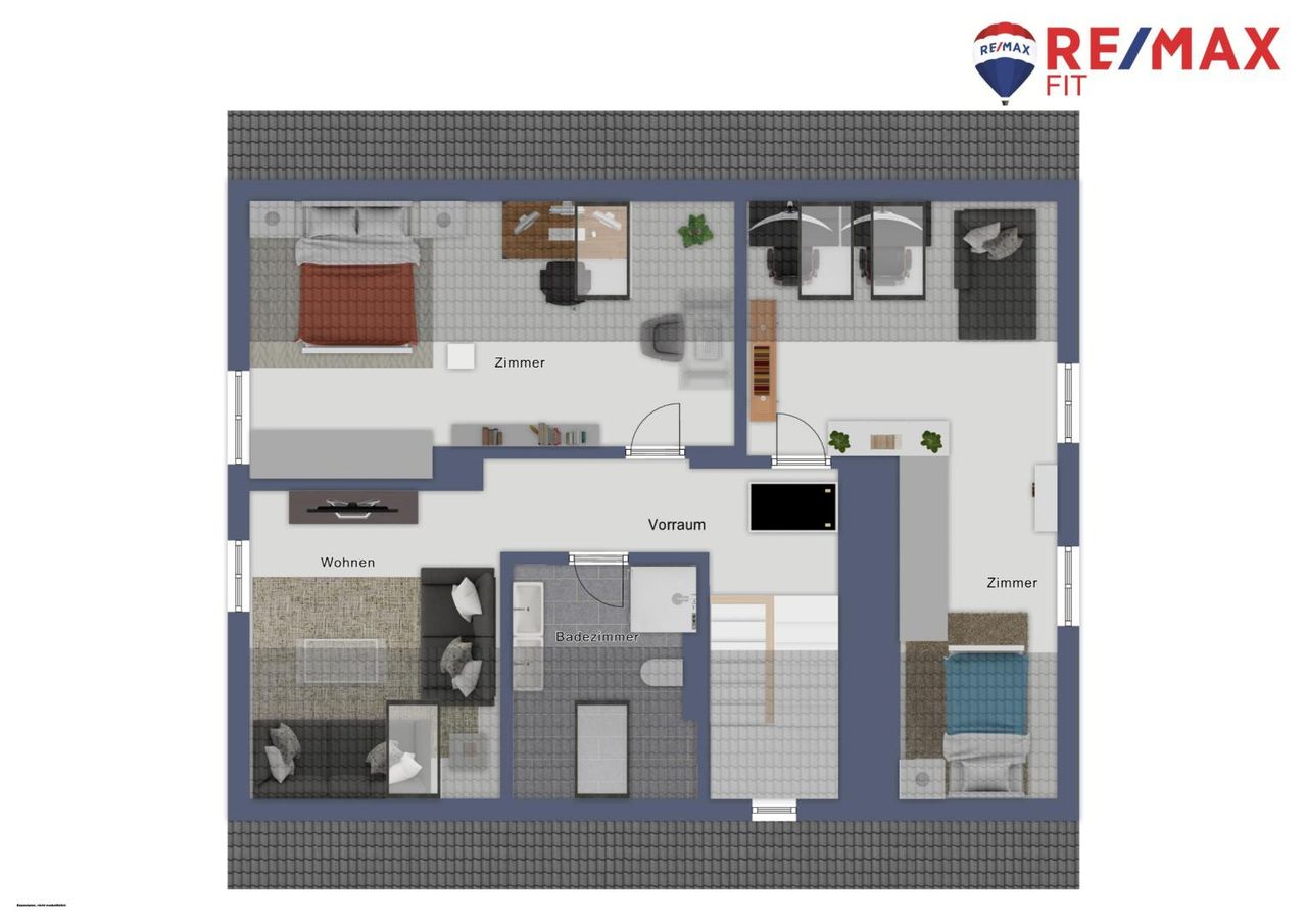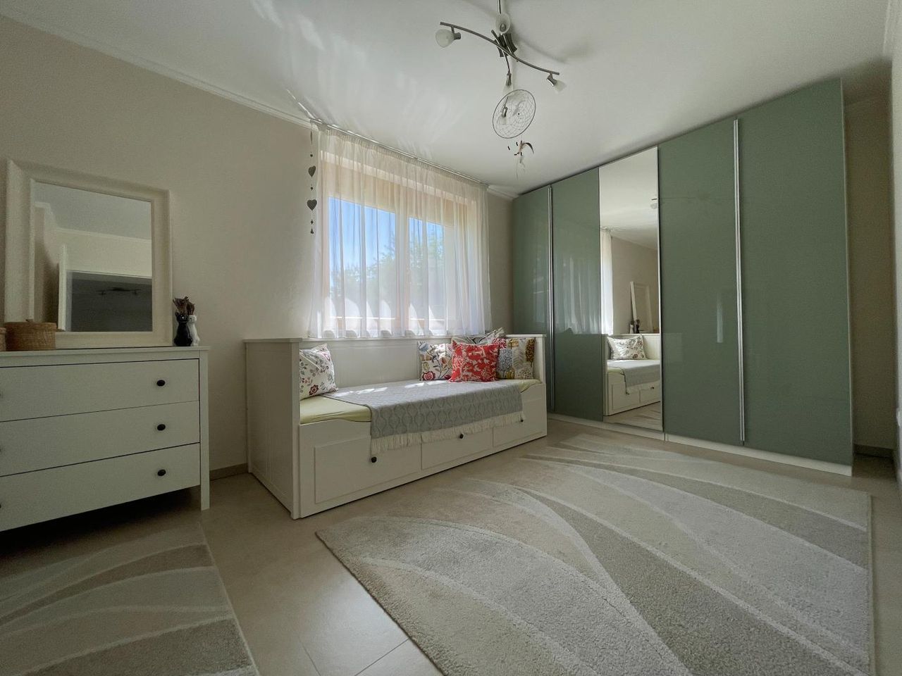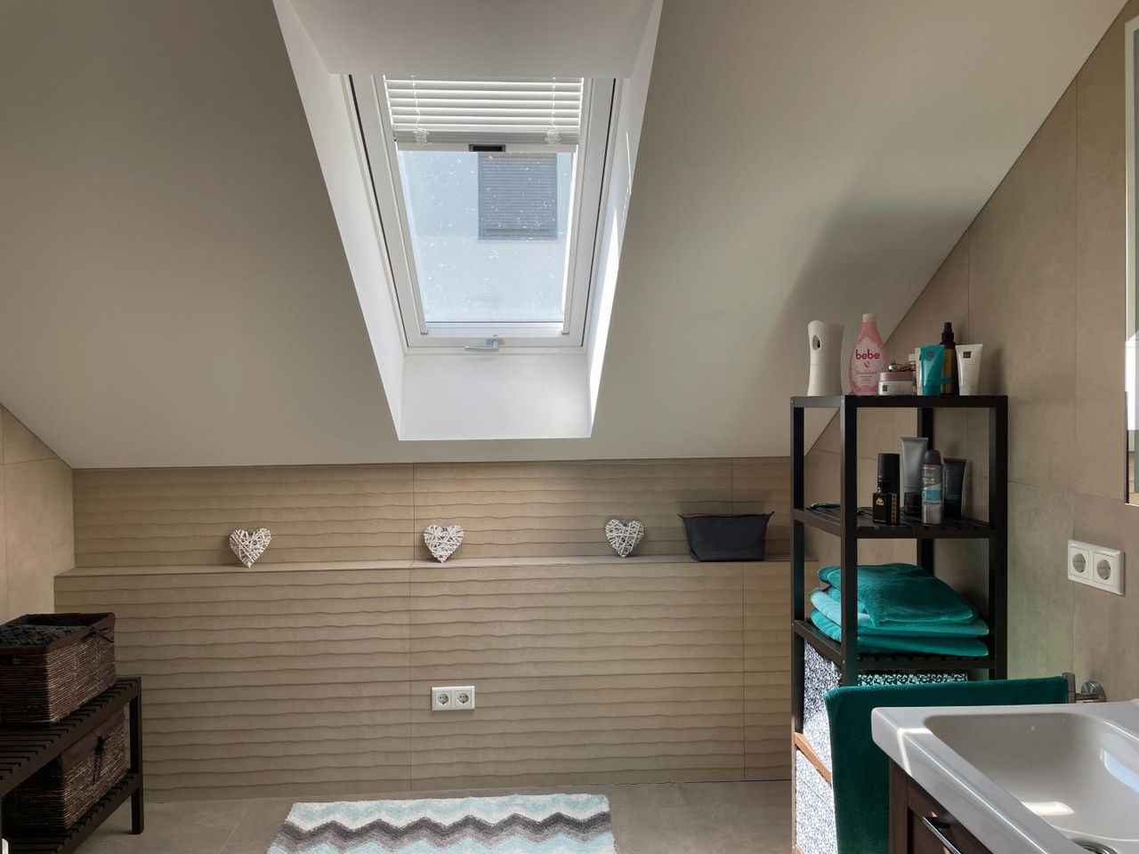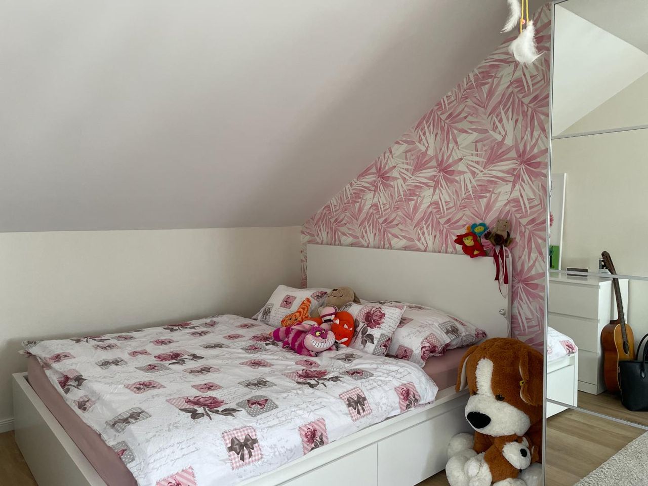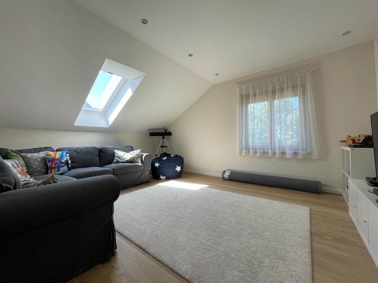 Im ausgebauten Dachgeschoss befinden sich zwei helle, große Kinderzimmer, ein modernes Badezimmer mit Dusche und WC sowie ein offener Wohnbereich – perfekt als Spielbereich, Lernzone oder als Trainingsbereich für Yoga etc.