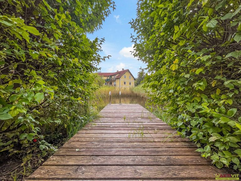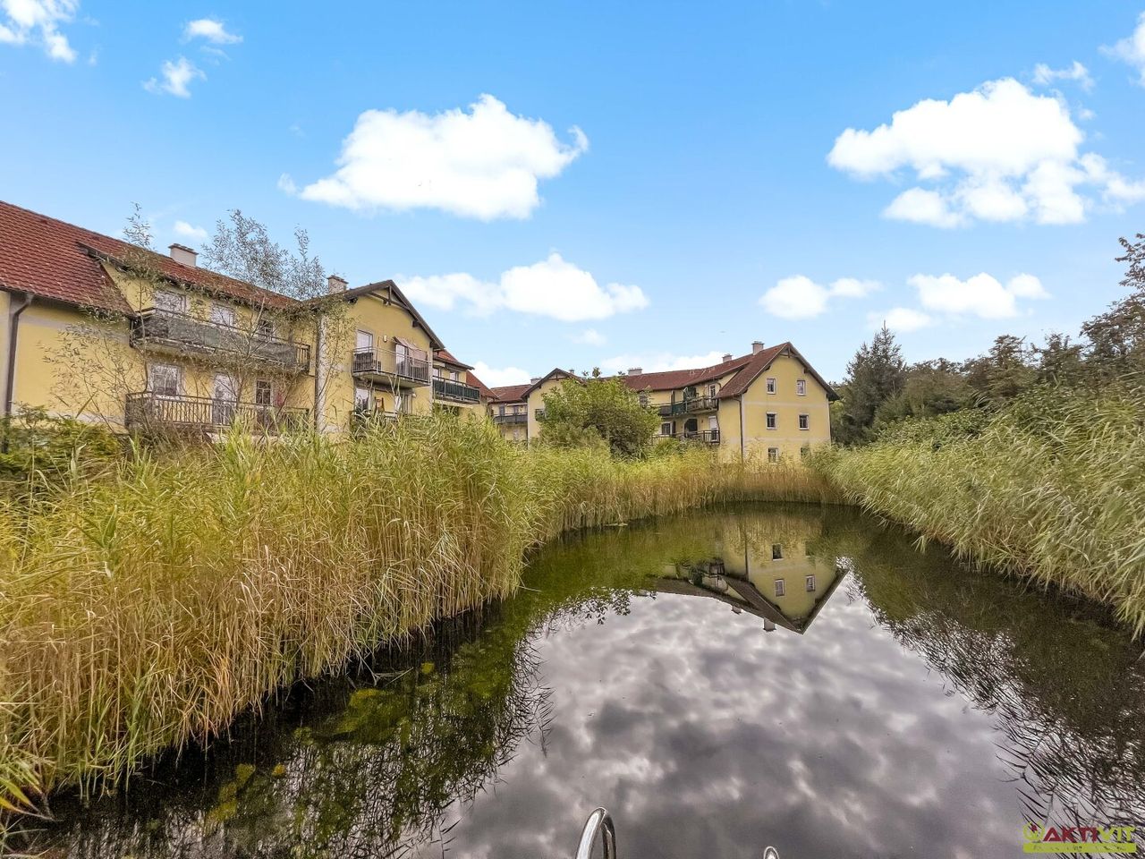 Ein großzügiger Gemeinschaftsgarten mit Spazierwegen und Natur-Badeteich steht zur Allgemeinnutzung zur Verfügung.