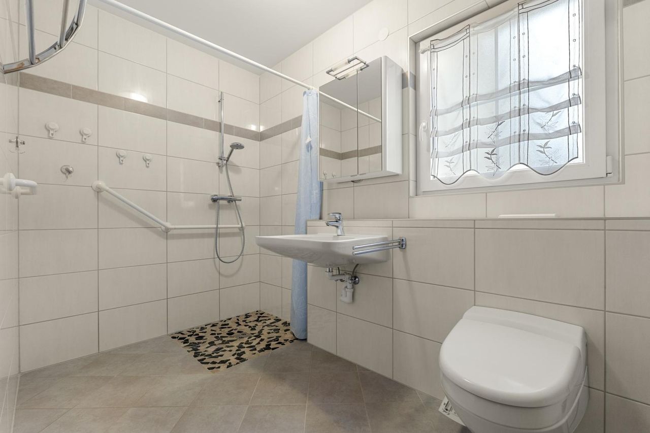 Die Badezimmer sind komfortabel ausgestattet. Das Badezimmer im Erdgeschoss bietet eine barrierefreie Dusche und ein WC, während im Badezimmer im Obergeschoss eine Badewanne, barrierefreie Dusche und ein WC vorhanden sind.