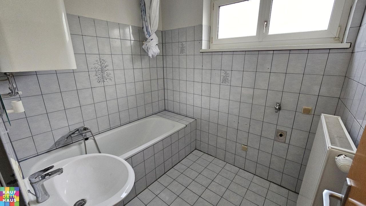- Badezimmer mit Badewanne, Waschmaschinenanschluss und Fenster