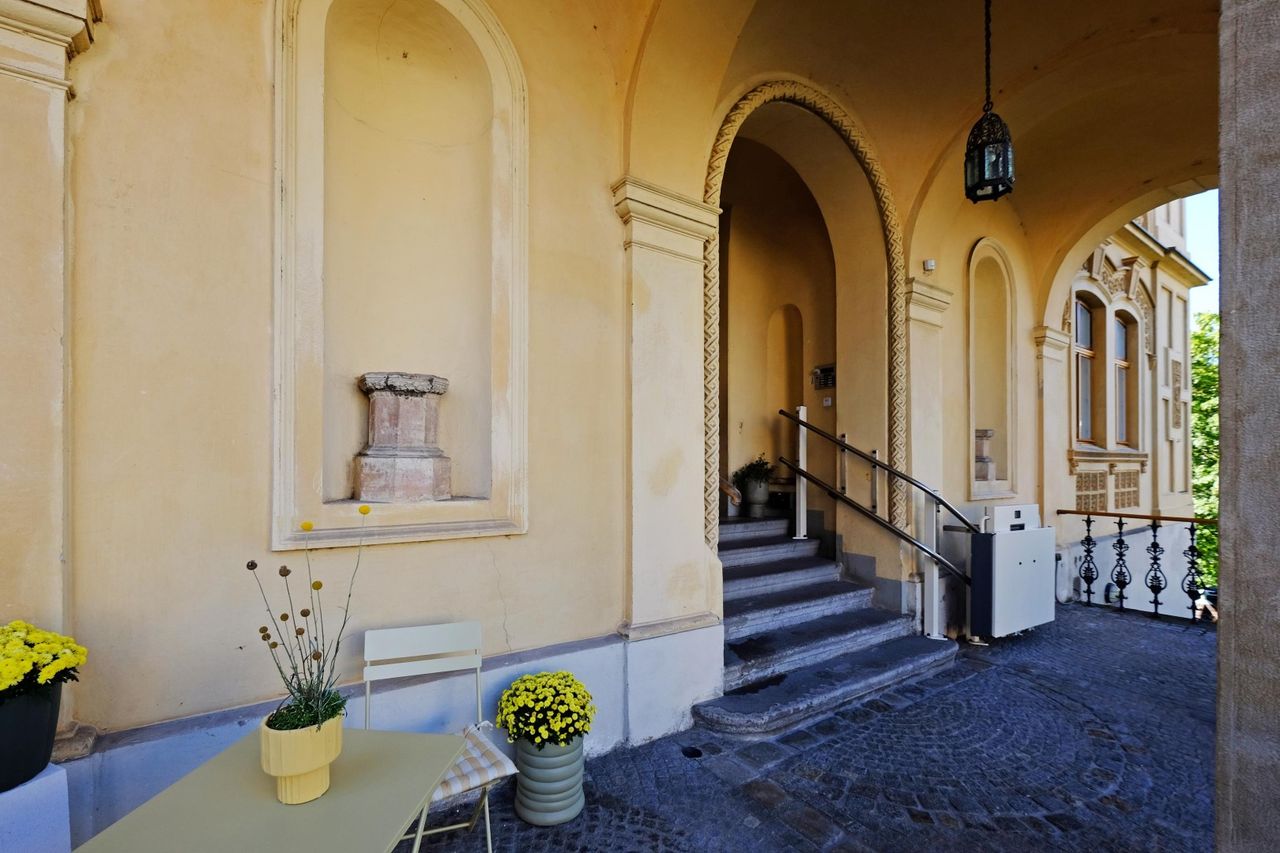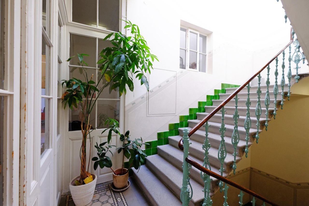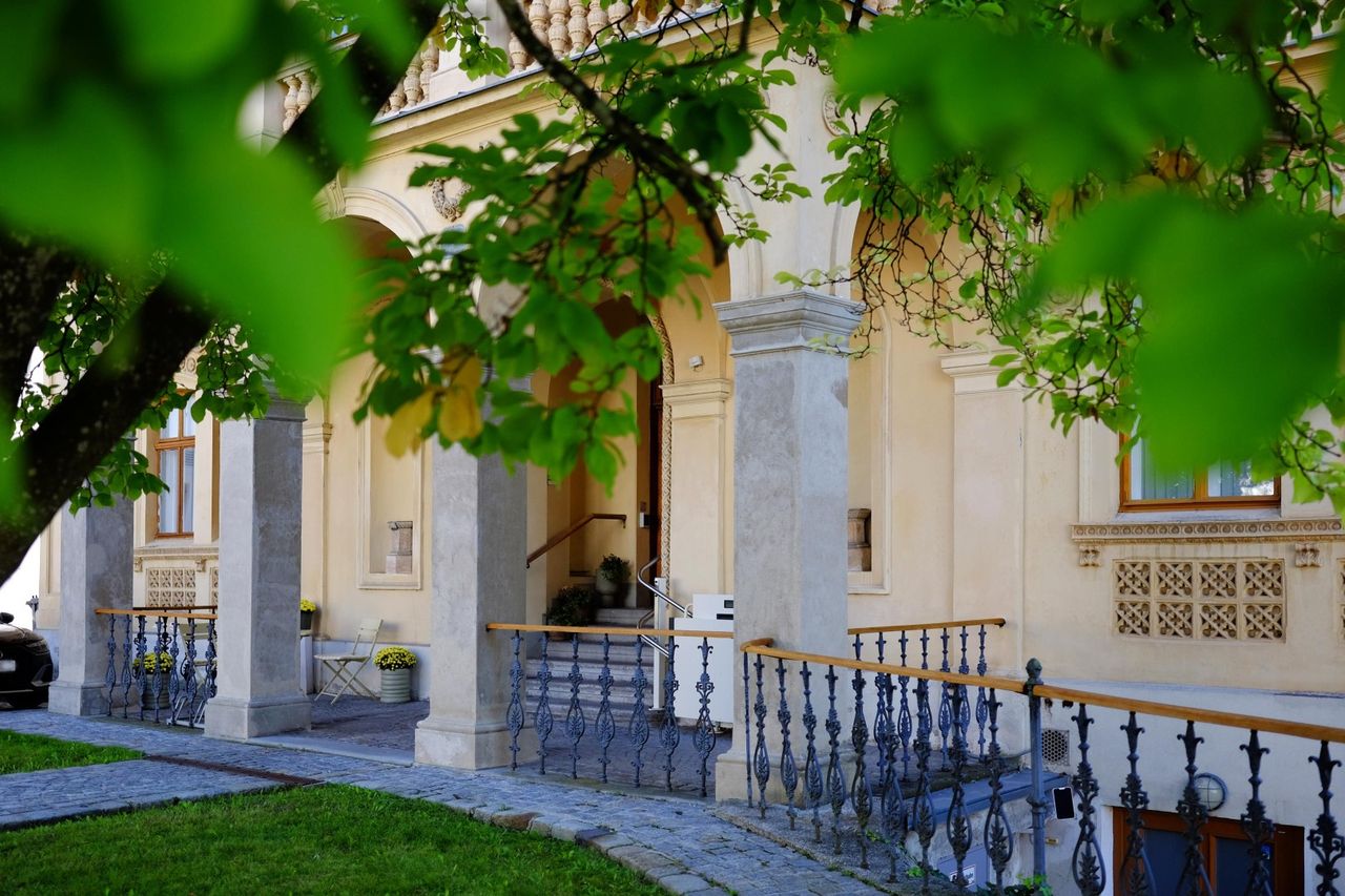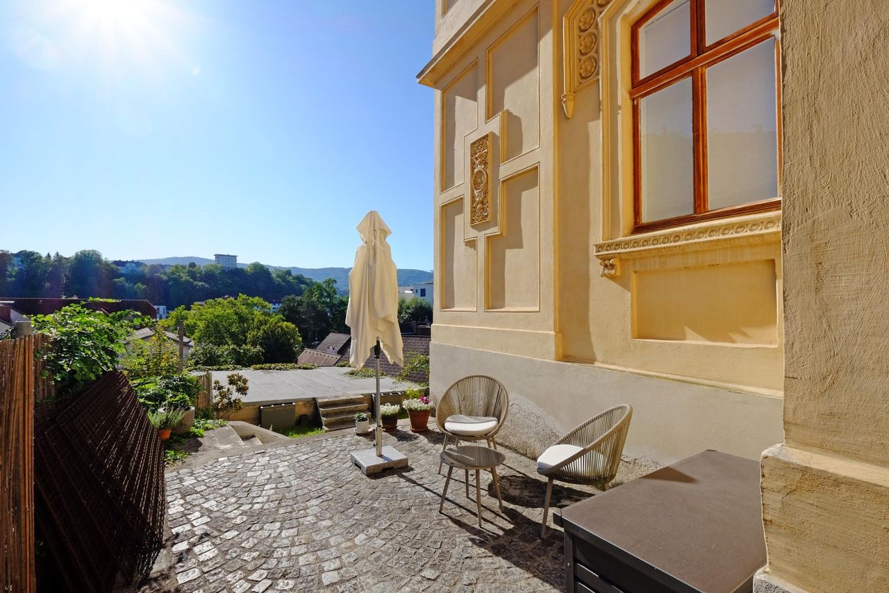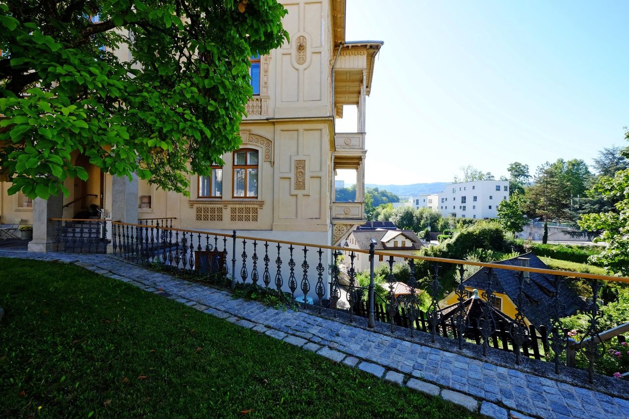 In der VILLA ALMEROTH sieht man die historischen Elemente wie schmiedeeiserne Stiegengeländer, historische Kamine und imposante Holzbalken.
