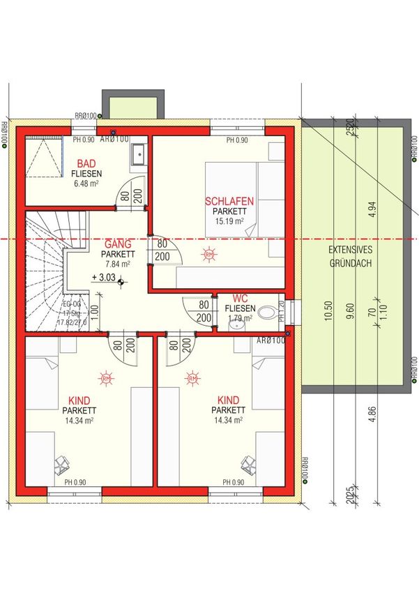 - Stiege: Die Trittstufe der Stiege wird mit dem gleichen Parkettboden belegt. Die Setzstufe wird weiß beschichtet.